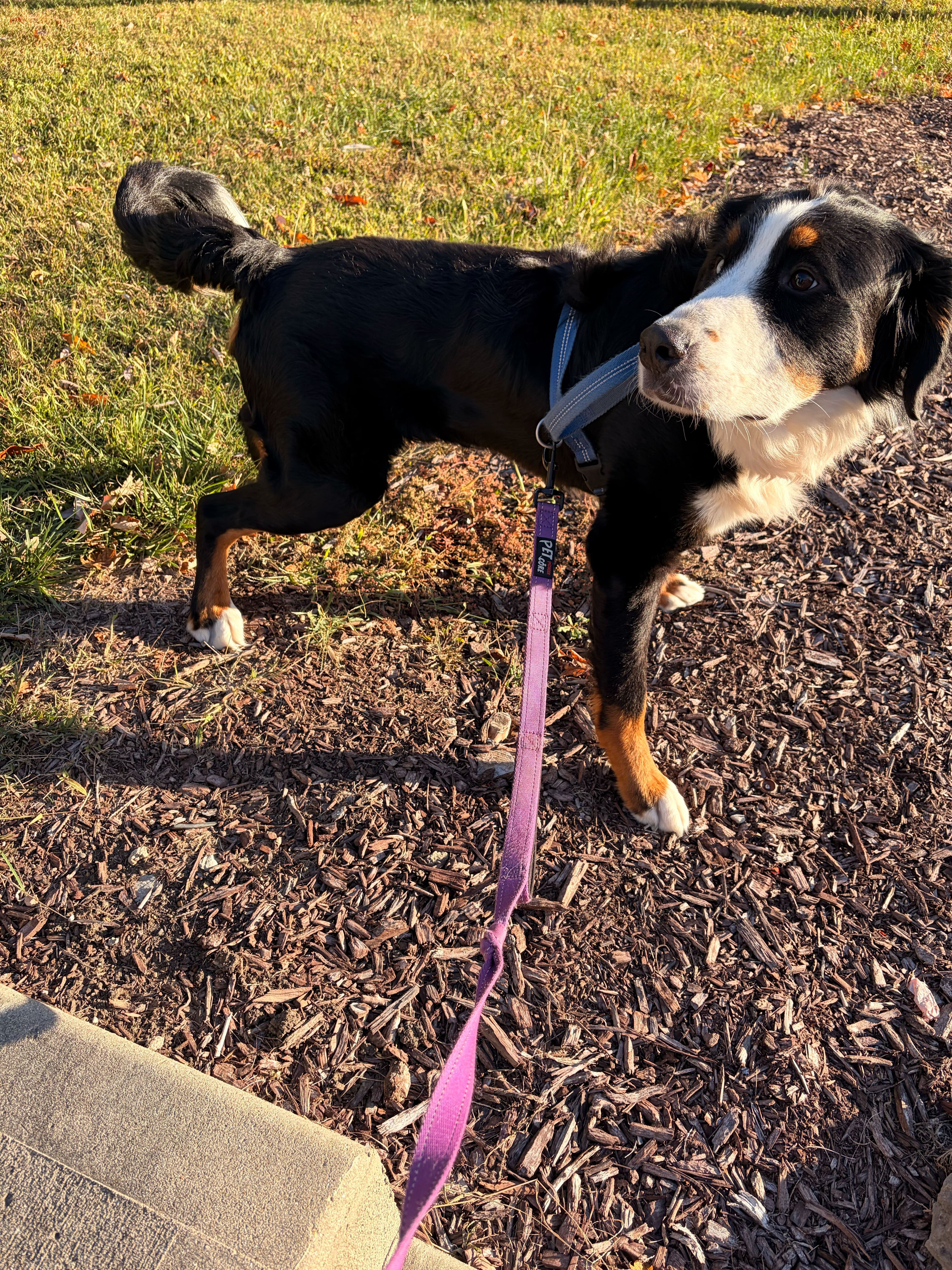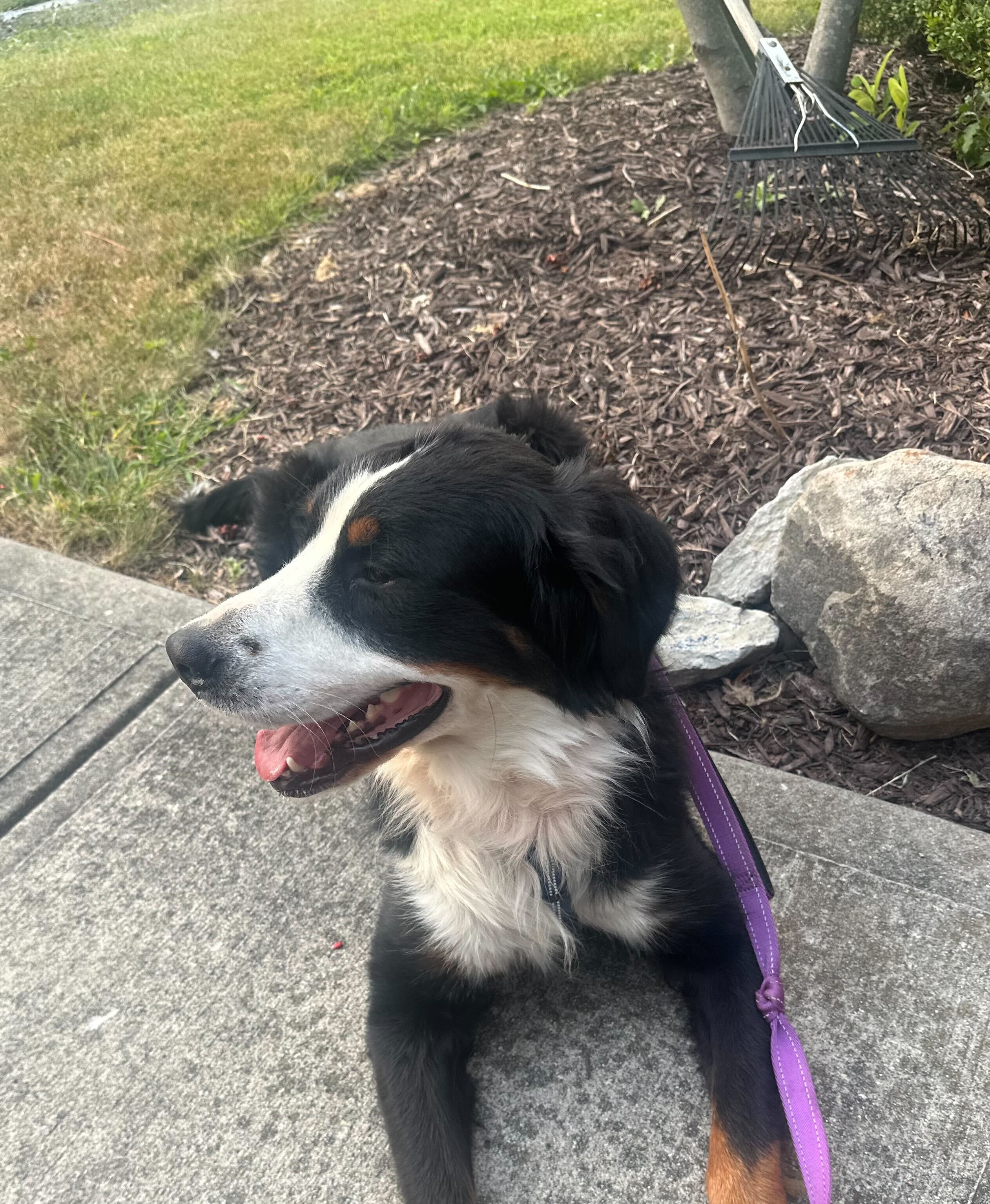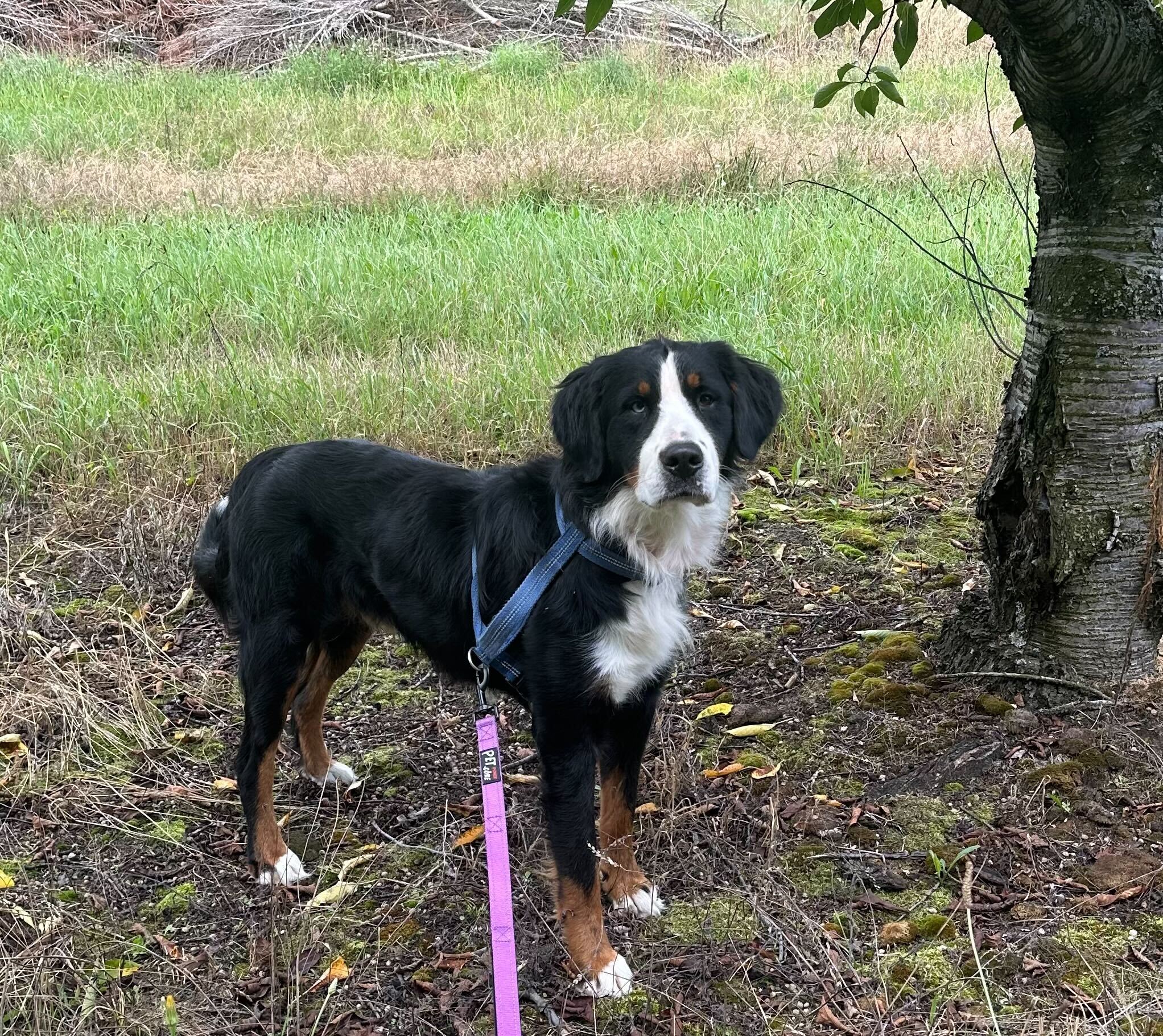 Wrangler is looking for a walking buddy. He is an approximately 15 month old Bernese Mountain Dog. He loves to go on walks more than anything. He also loves dogs. He is indifferent to cats. He is fine with all children but does not play with them. He is crate trained, house trained and neutered. Unfortunately, he came to us from a bad situation and with a heart worm infection. He recently completed his treatment and needs to stay calm for the next few weeks. Fortunately, he is a calm and well behaved boy. He will need a patient owner who is willing to give him the love and care he never received. He is still fearful of many things including doorways and strange dogs, and stairs and occasionally needs to be led by a leash or carried. He has slowly making progress but will need someone that can continue to work with him. A fenced yard would be preferable.