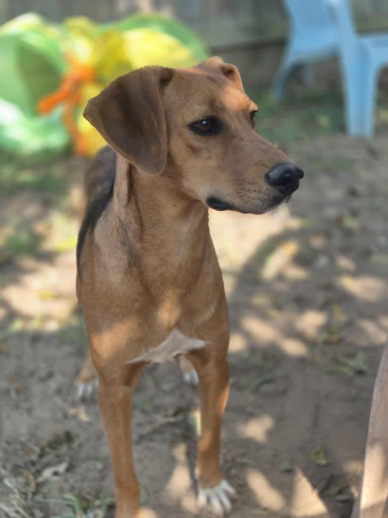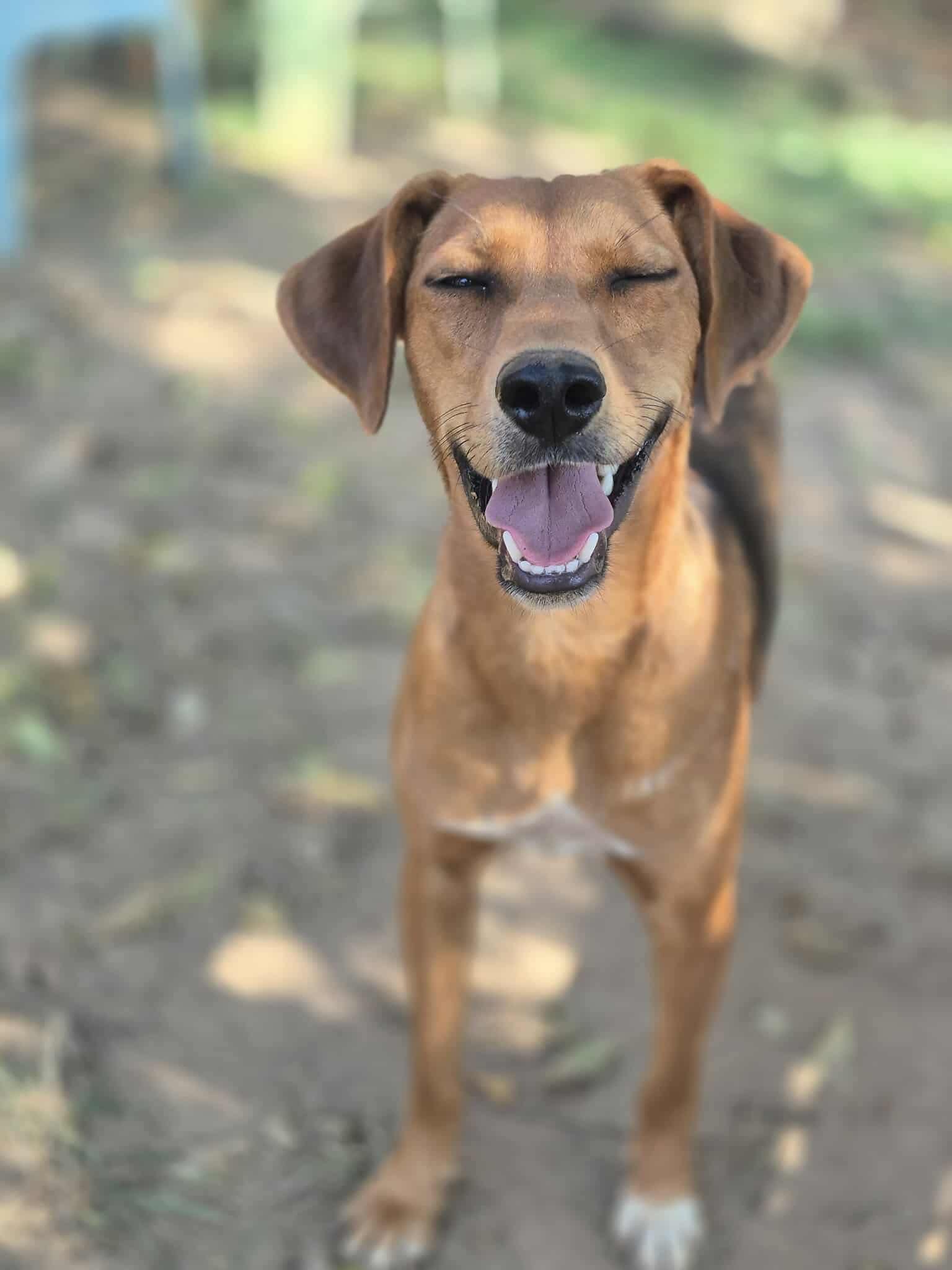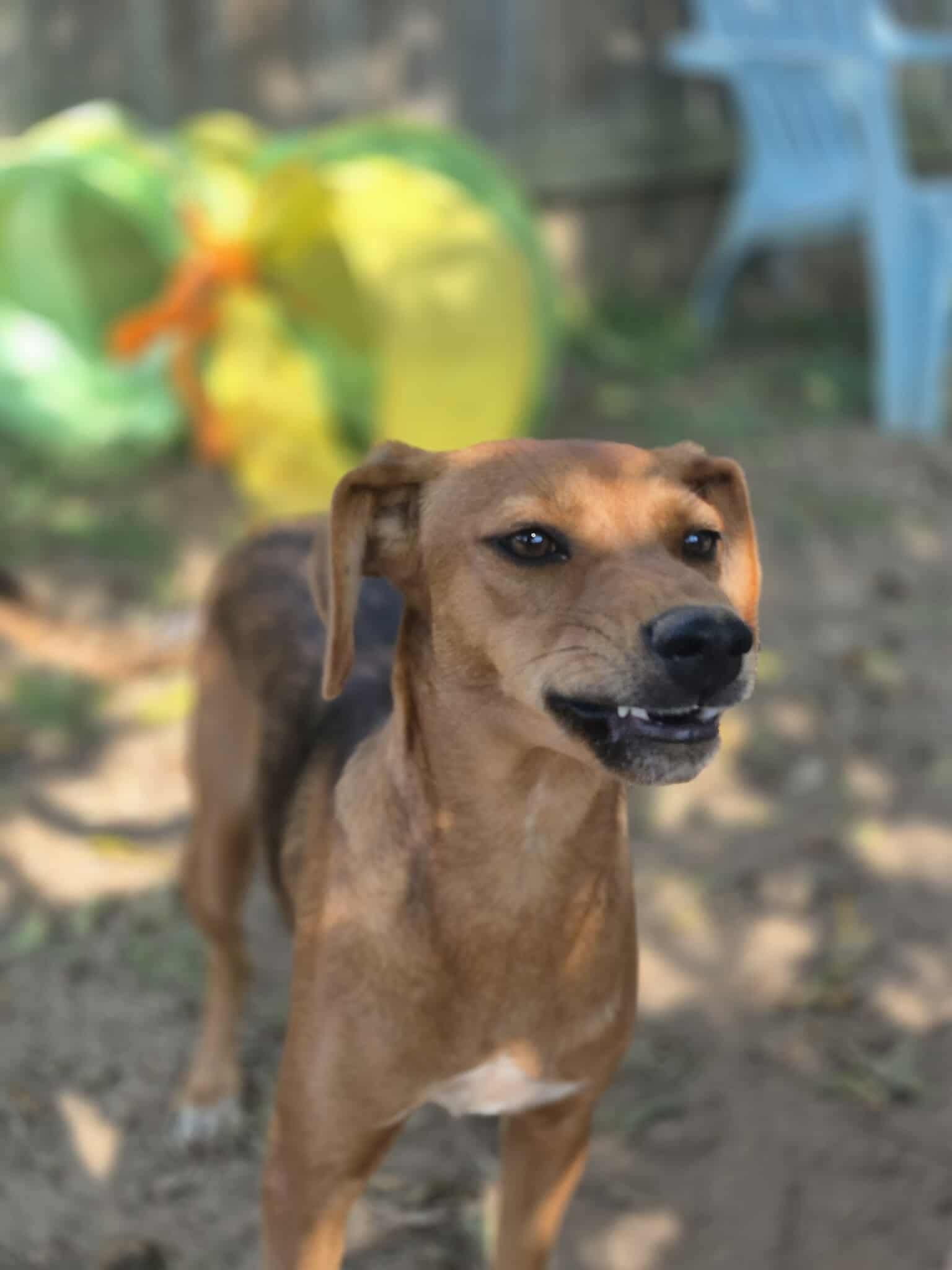 Super outgoing and friendly! Shes got puppy energy, and a puppy heart! She just loves everyone! Shs loved meeting new dogs through the fence, and loved following everyone that walked by her! I think she would do good in a home with kiddos around 8-14 years old.