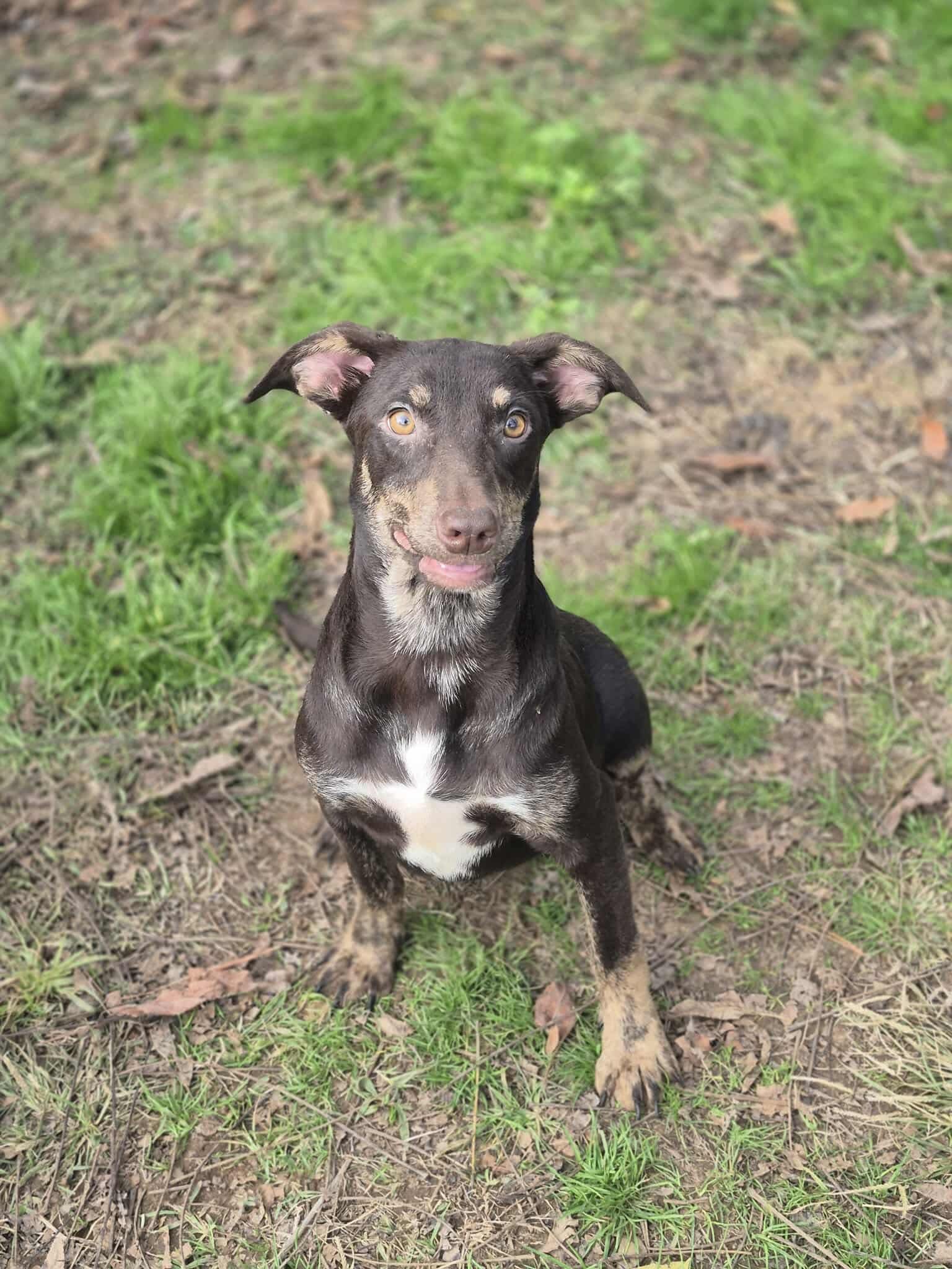 Extremely outgoing and friendly ! There's not a shy bone in this cuties body! She is goofy, and throws her paws / head around while she plays. She's medium to high energy, and full of kisses!