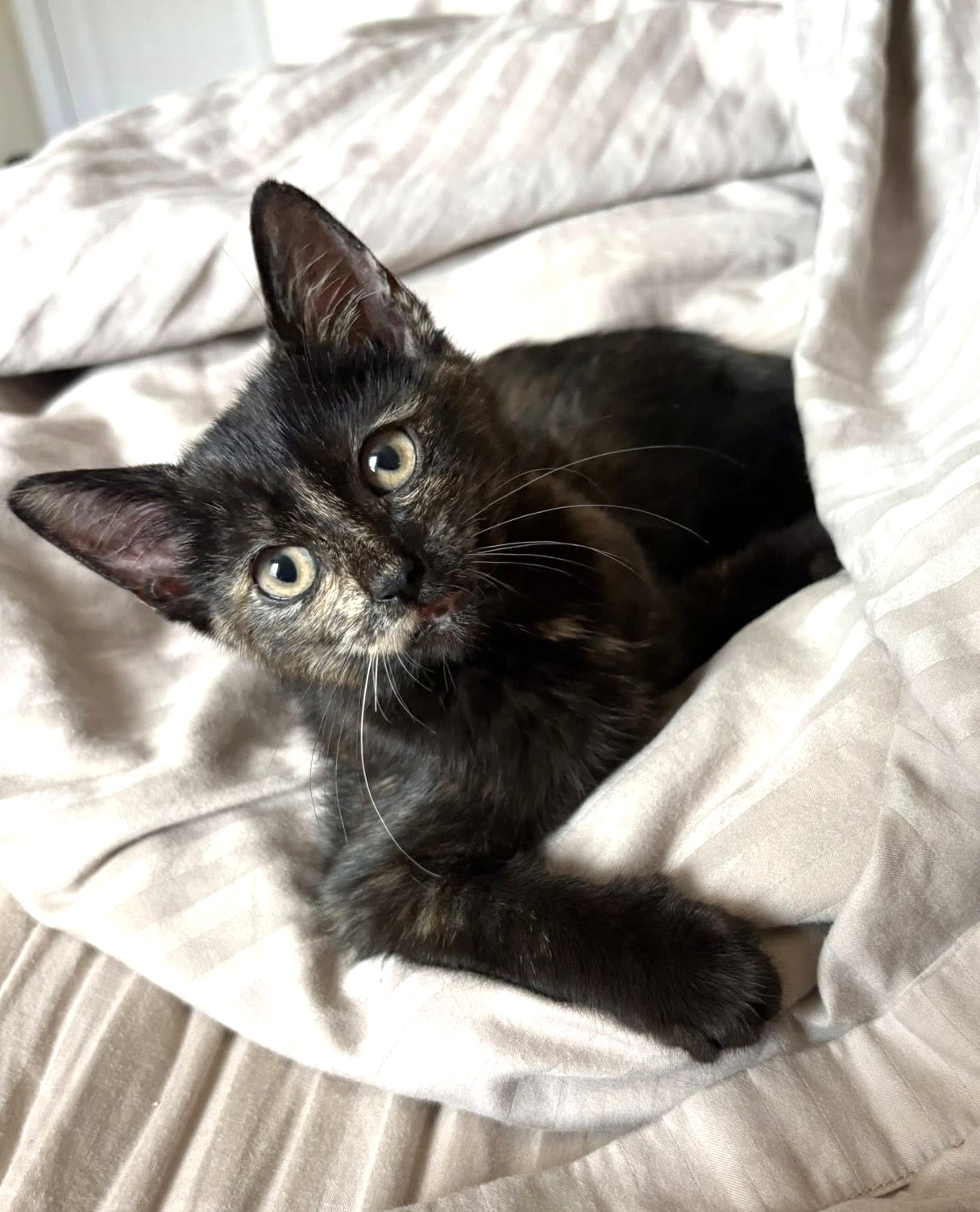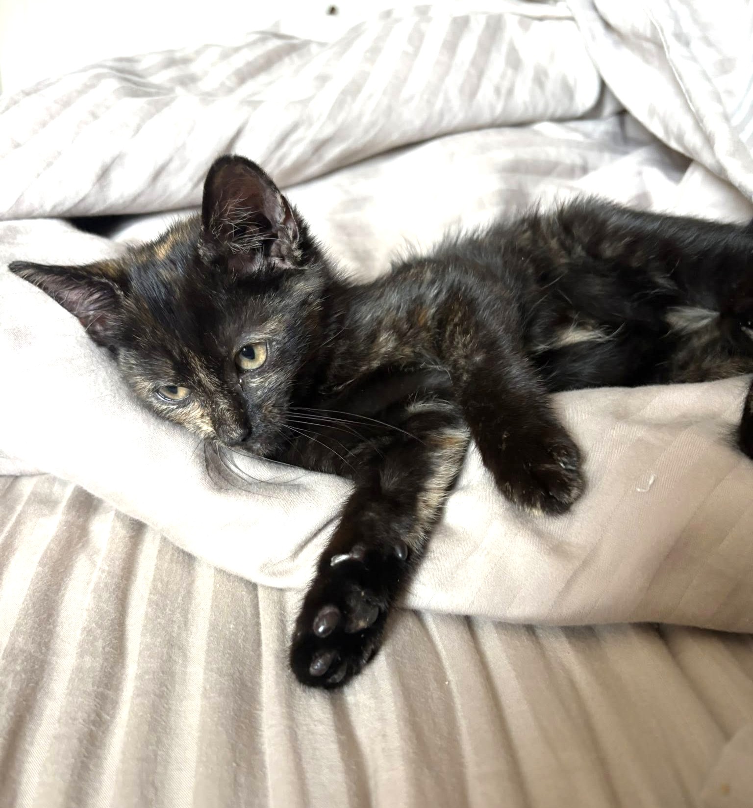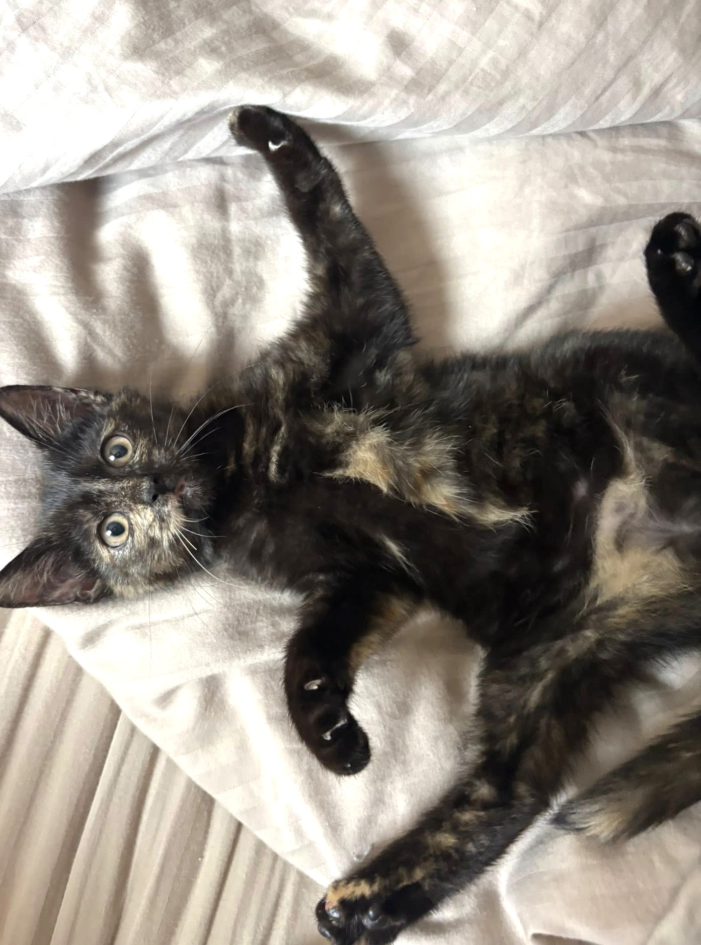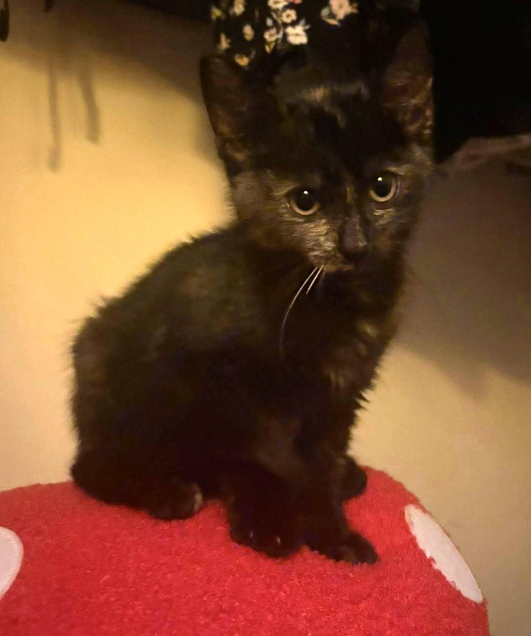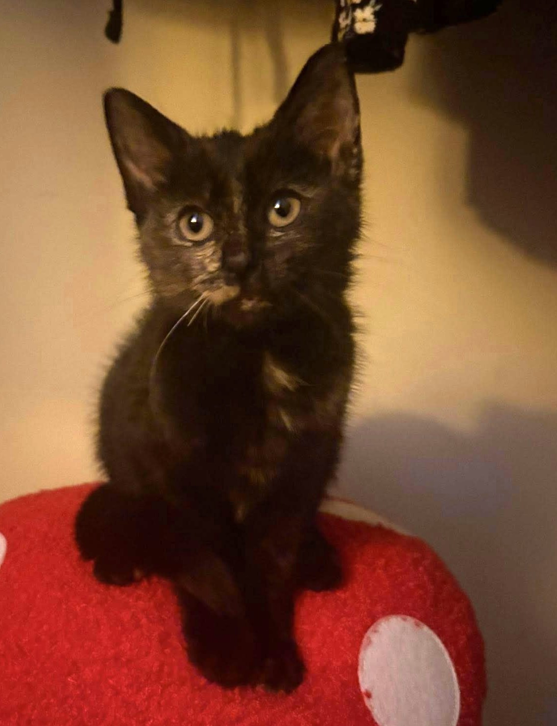 This is Autumn! The cutest little tortoiseshell kitten. She was found in the engine of a car after hearing her little meows for help. Shes currently about 7 weeks old, already litter box trained, super playful and full of energy but will also curl up next to or on top of you for a snuggle with non stop purrs. Autumn also loves a good head massage and will follow you everywhere you go. She gets along with dogs and cats once she’s had time to warm up to them. If you’re looking for a best friend in cat form Autumn’s your girl!