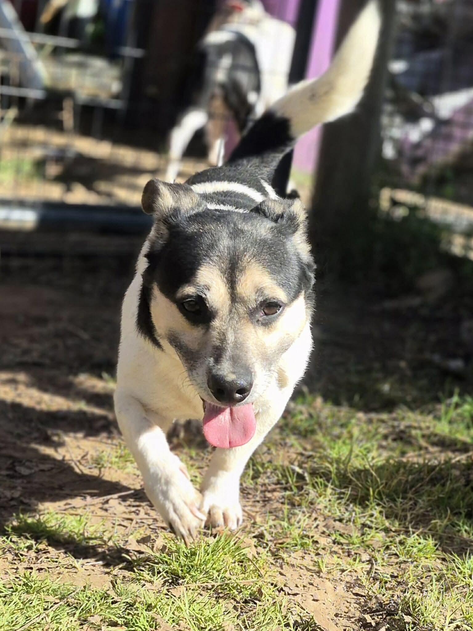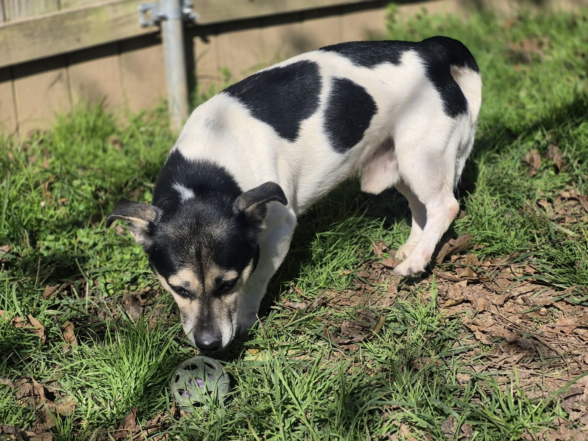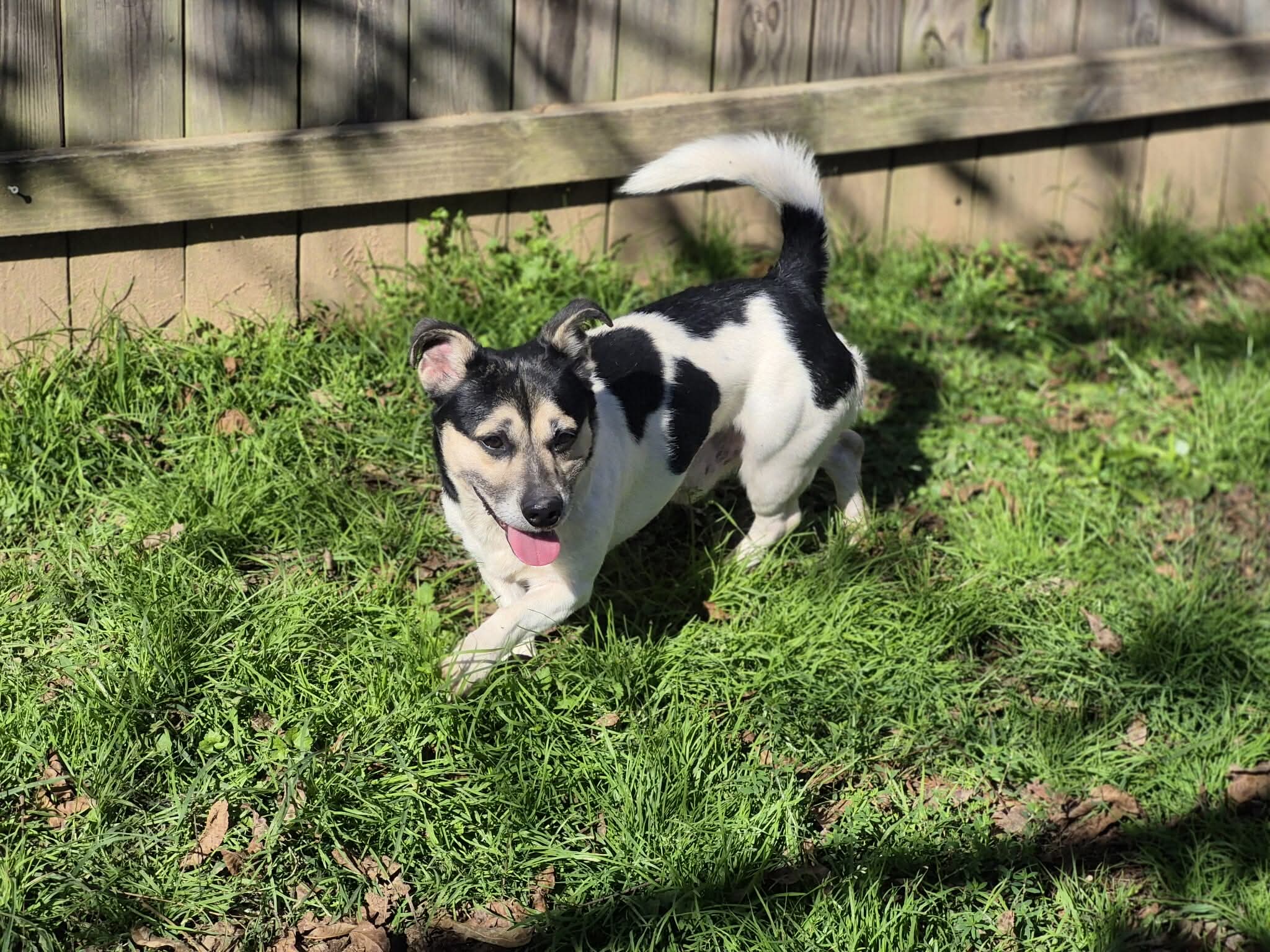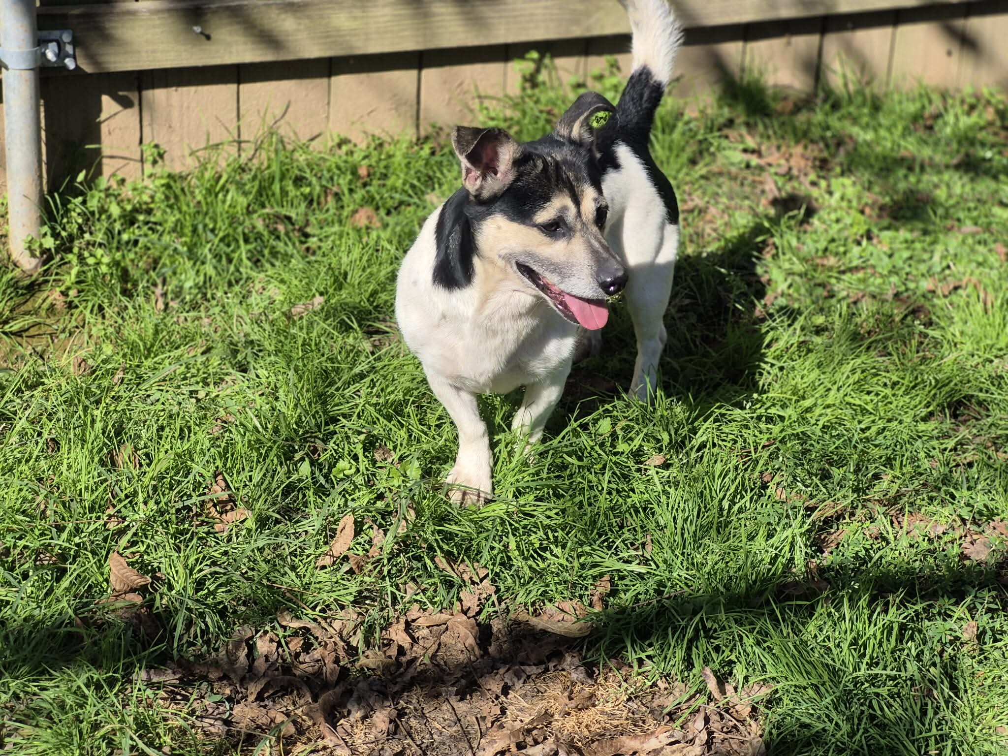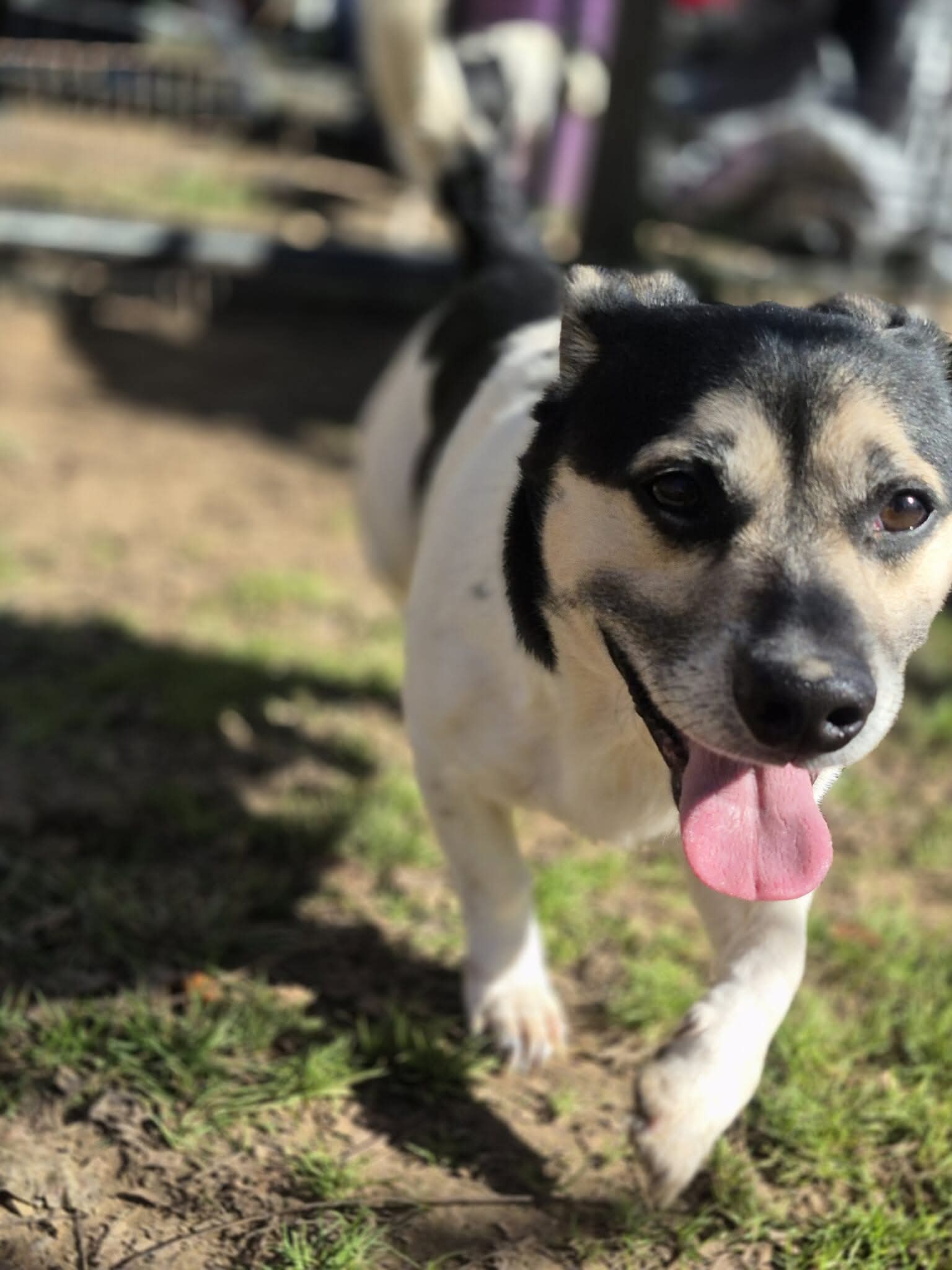He is very outgoing and sweet! He doesnt walk on leash, but he doesnt mind being carried! He is dog friendly, and LOVES to play! While he didnt touch the toys, he did play with millie when she came into the play yard! He didnt mind that she was 3 times his size, he made a friend!! Millie likes to squeak when she plays sometimes, and that just made his day! He isn't super food motivated, but comes running when you smooch at him!
