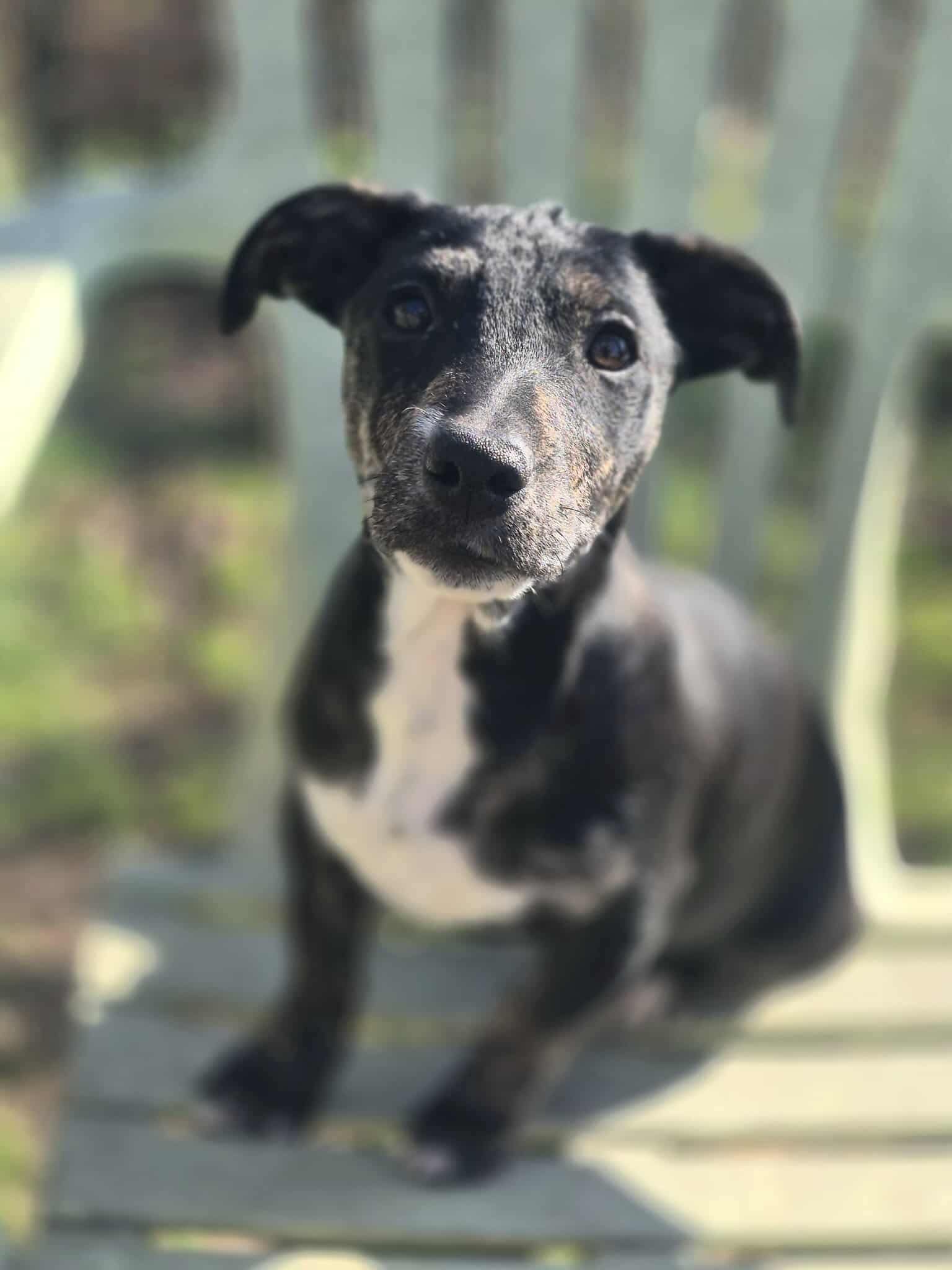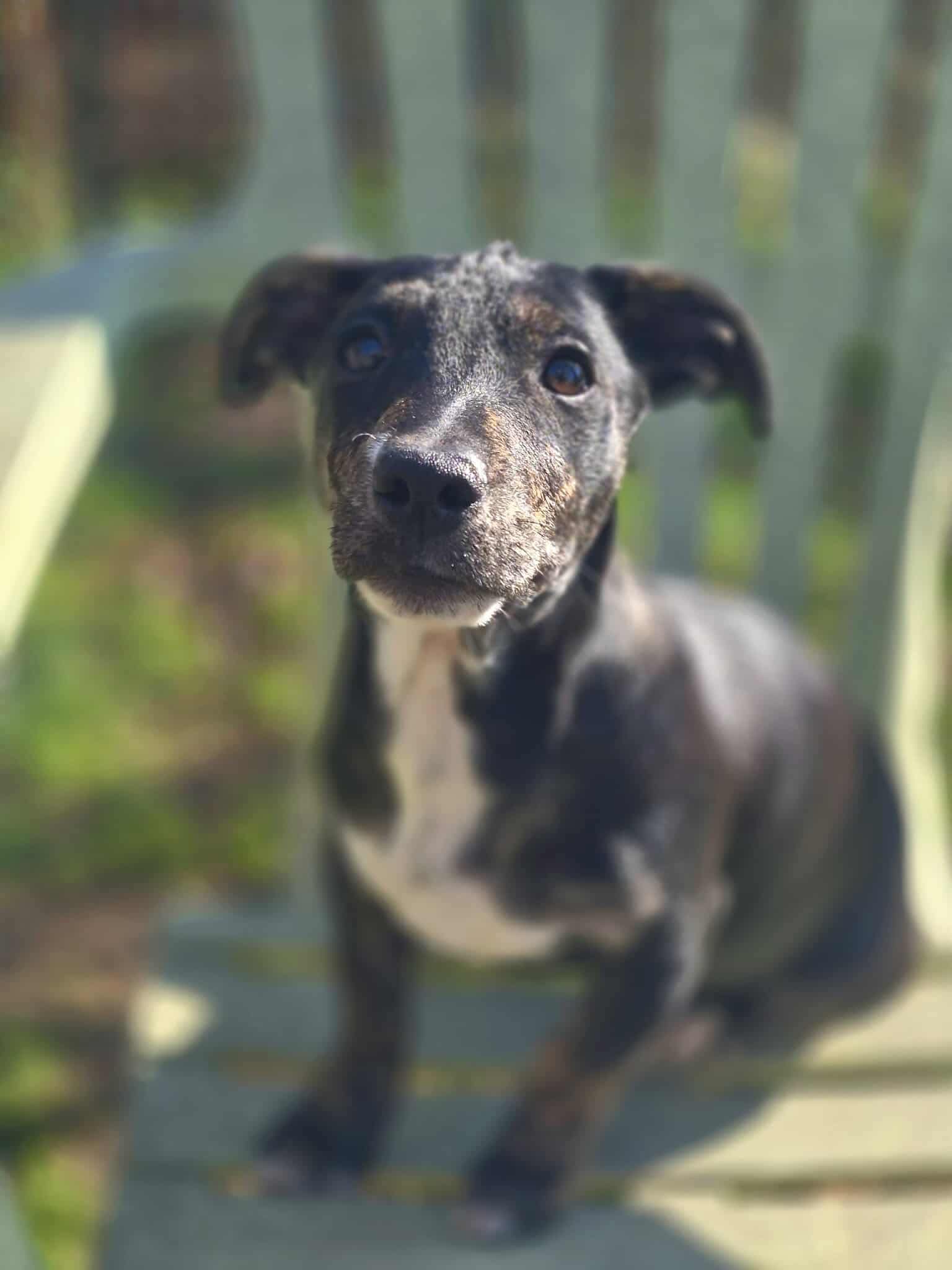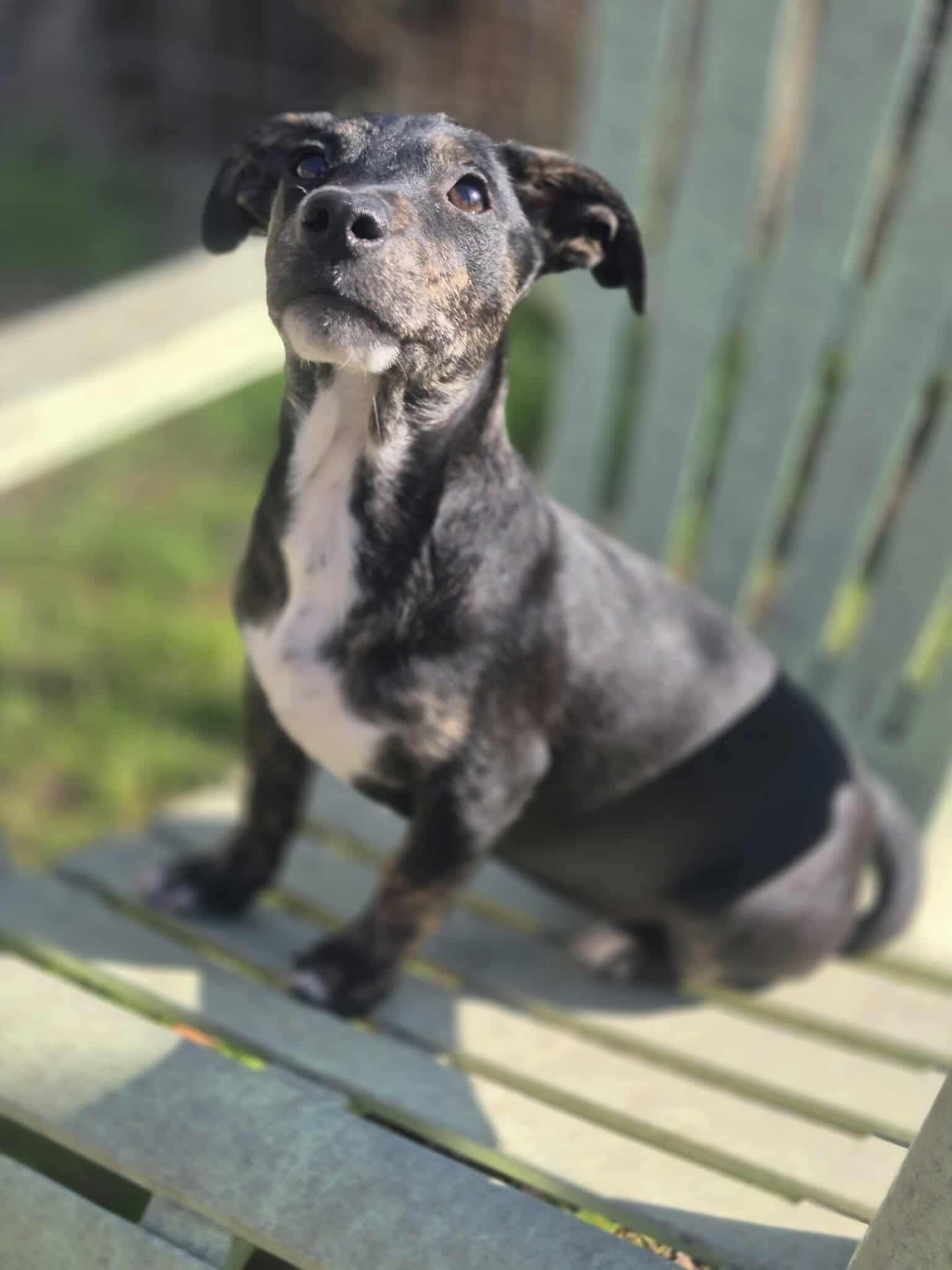 She comes off as a bit timid at first. Loud noises spook her, and she's cautious about walking around. However, once she gets in your lap, and the cuddles start, she turns into a happy little puppy with all the kisses and tail wags you could possibly imagine! She stayed in the chair pretty much the entire time, she just wanted to be held and reassured. She is very loving, just scared of the big world around her.
