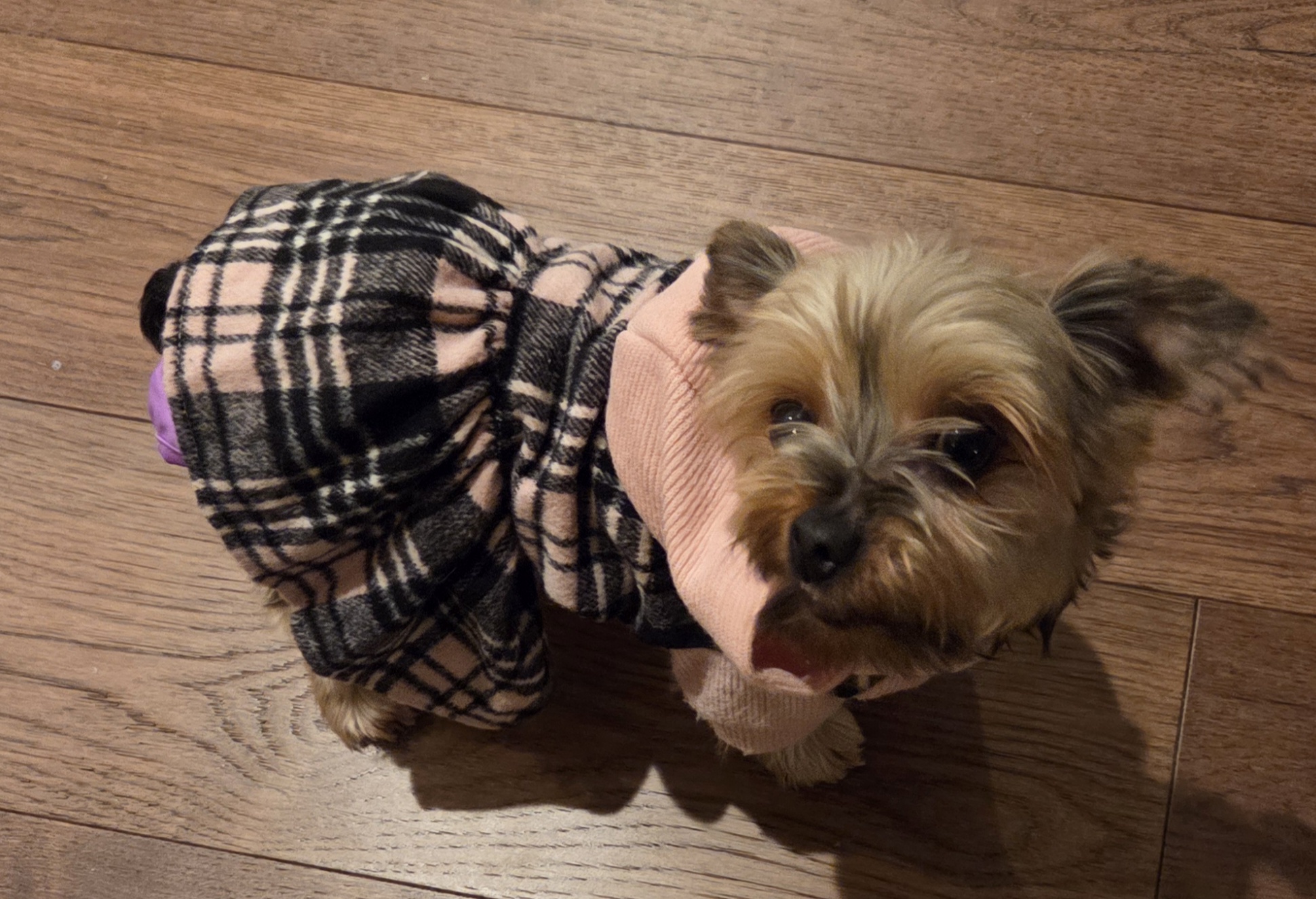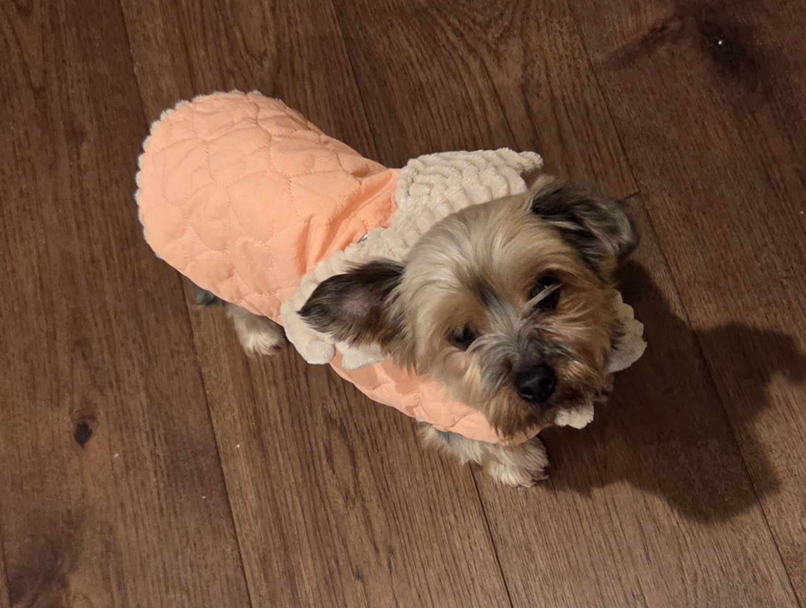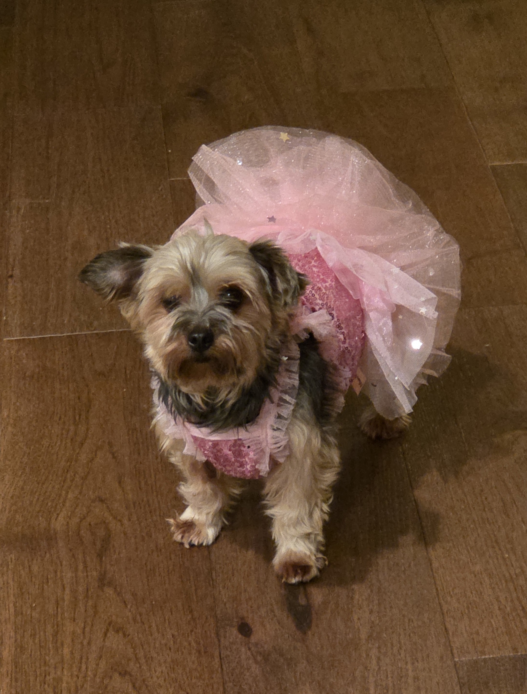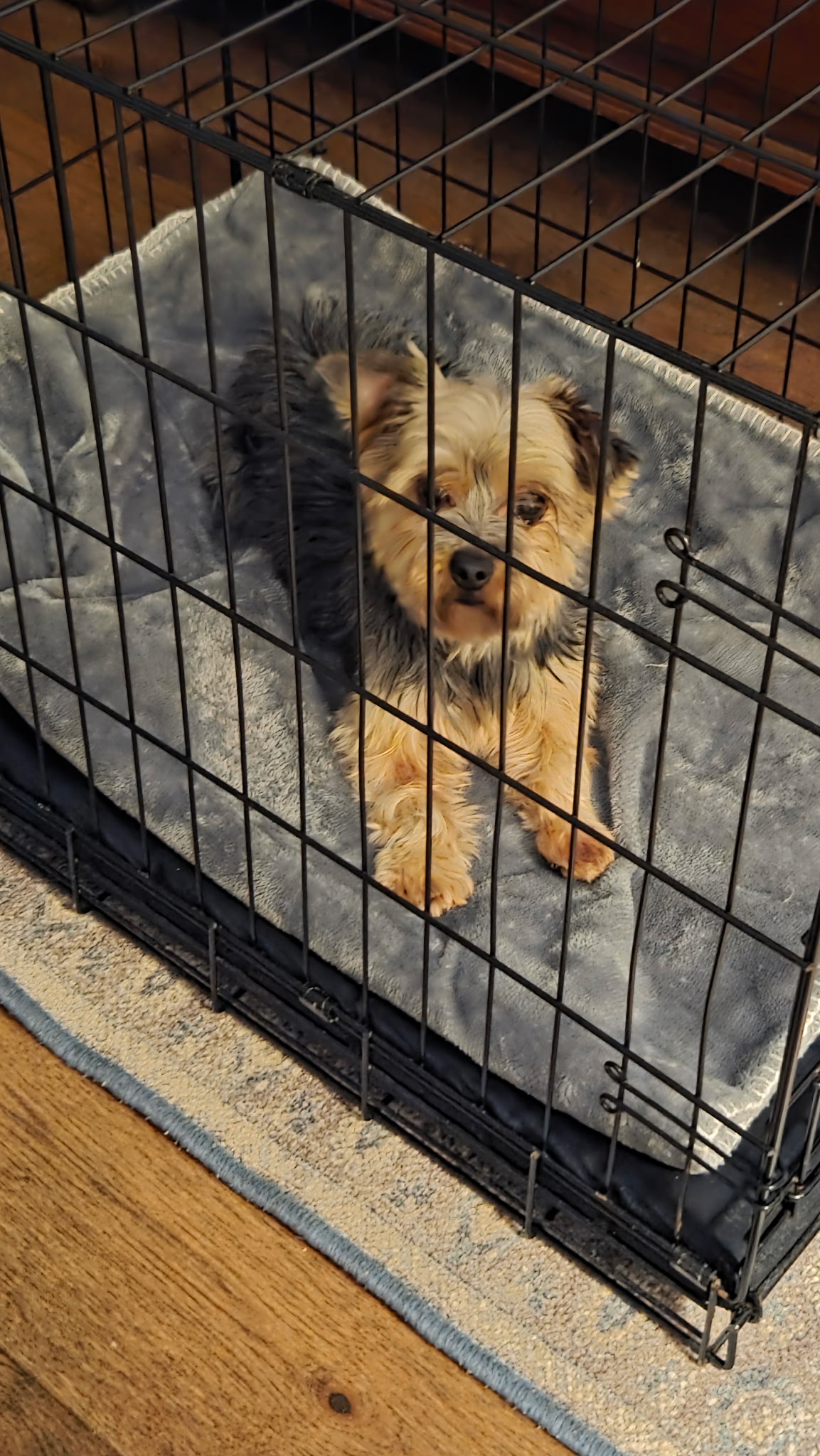 Training: Glinda is doing wonderfully with her crate—she settles in quietly, doesn’t bark or fuss, and sleeps through the night with no accidents. In the morning, she waits patiently to be let out. She’s still working on her leash skills, but she’s making progress. Glinda uses wee-wee pads reliably in an enclosed pen and knows she can earn a reward for going in the right spot, which makes continued potty training much easier.