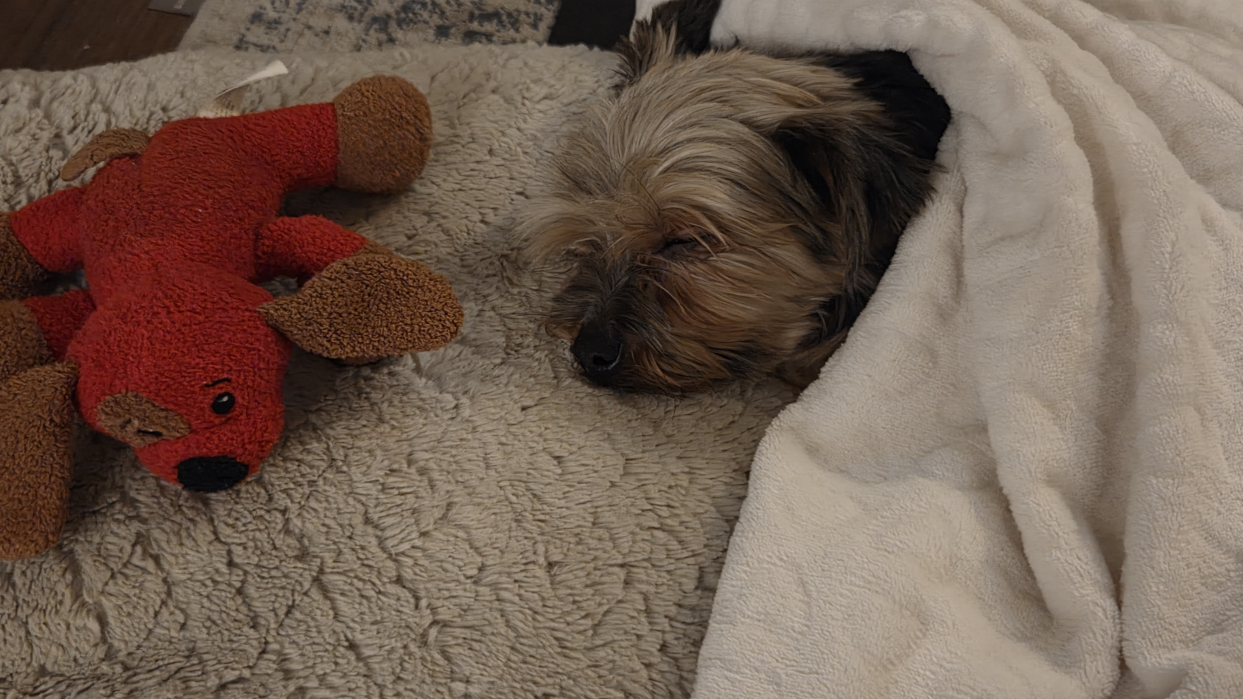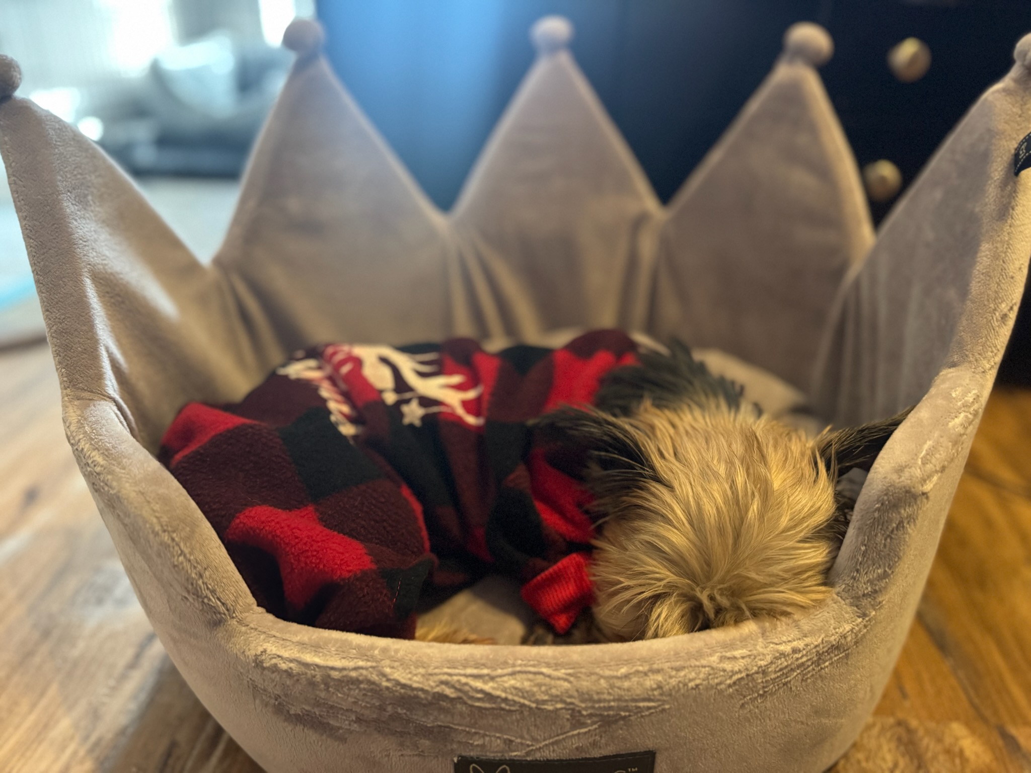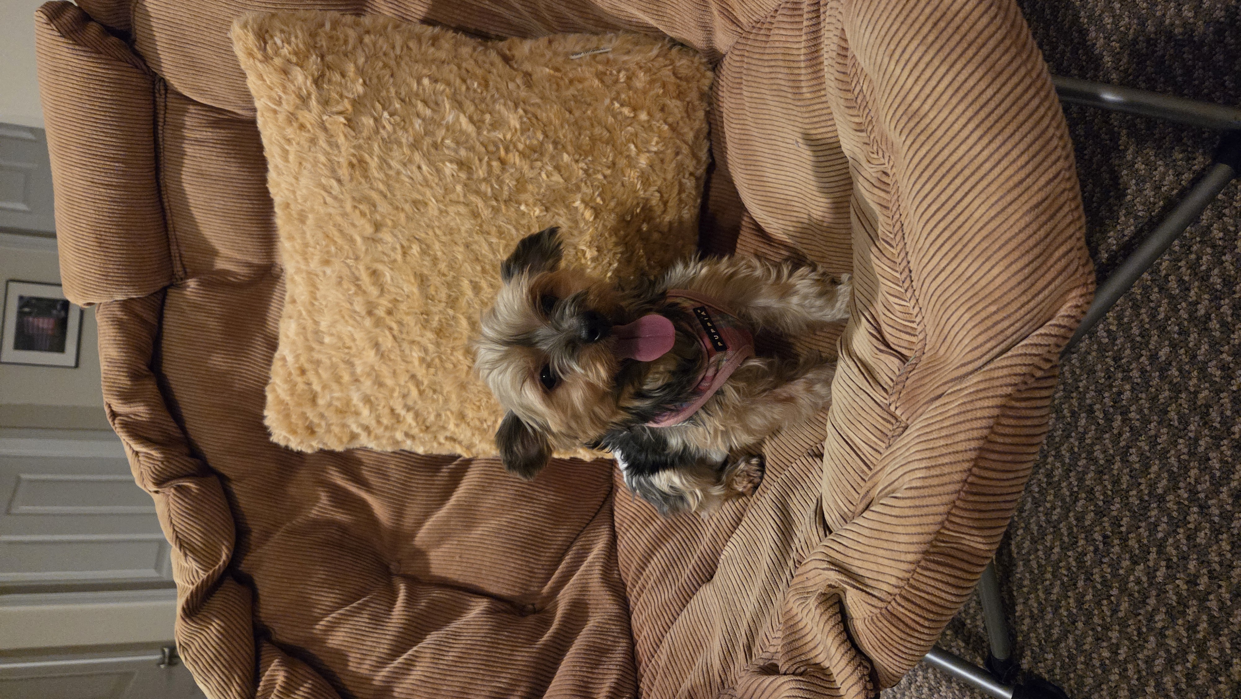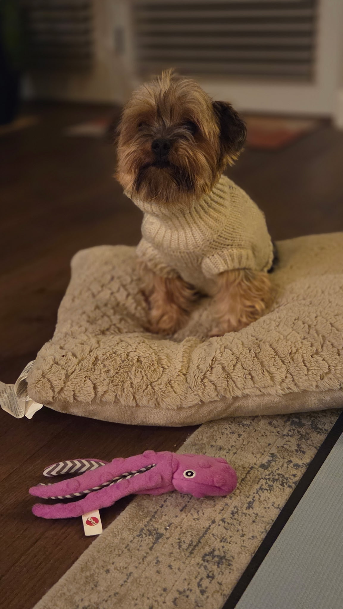 Personality: Glinda is an incredibly sweet and affectionate girl who loves to snuggle and stay close to her person. She’s a gentle explorer, happily sniffing her way through the world and taking in every new scent. Glinda is becoming more curious about toys—she’ll proudly carry them around or even curl up and nap on them. She’s also very food-motivated, which makes bonding and training with her extra fun.