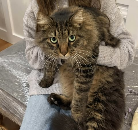 We believe Mr. Kitty may be a Maine Coon mix, and he has been slowly and successfully acclimating to indoor life. He is currently being fostered in a home with children and does wonderfully with them. The kids shower him with love and attention, which he happily accepts. He adores being petted, purrs endlessly, and loves lounging in a soft, cozy bed. When he’s especially content, he kneads his paws on the blankets to show just how happy he is.