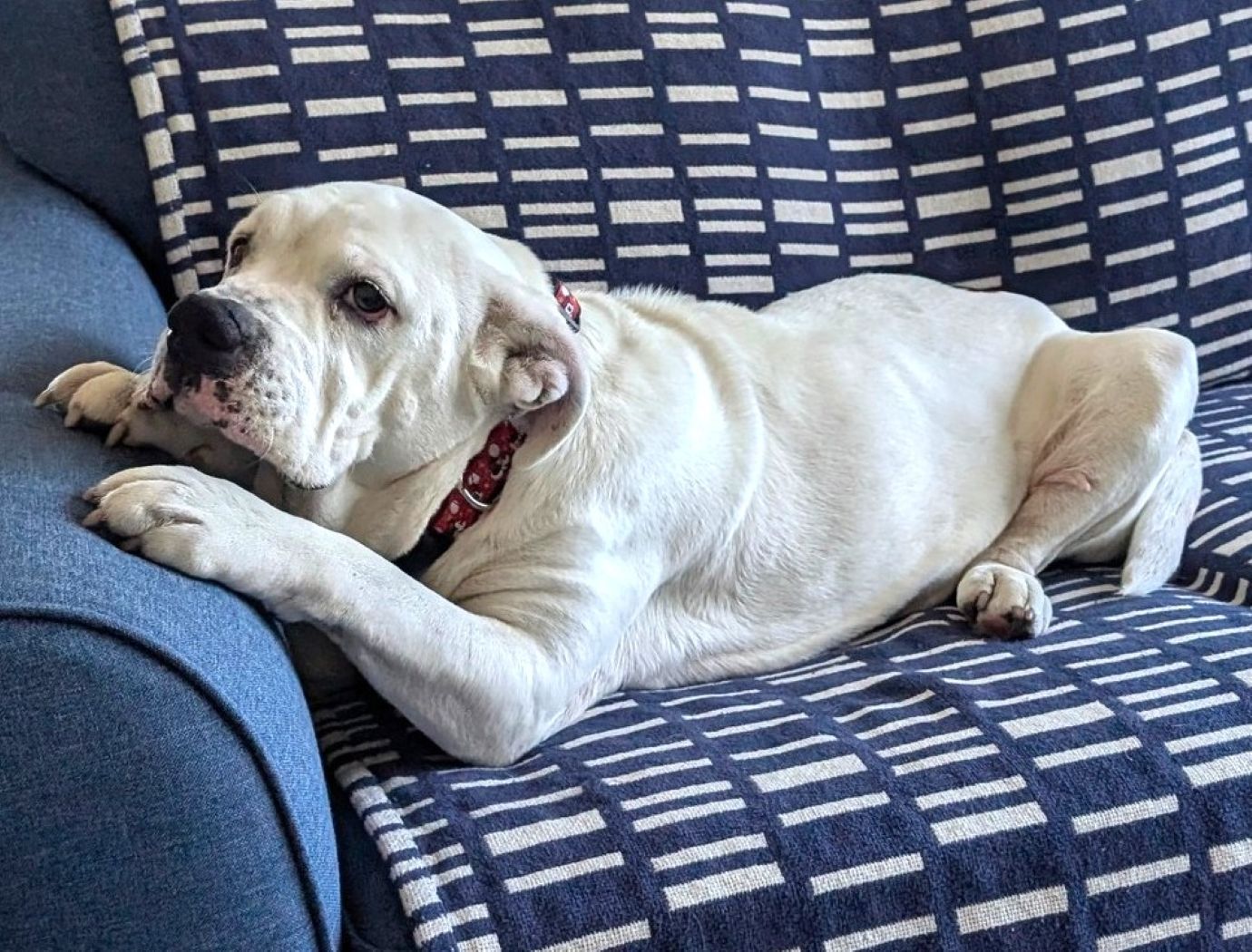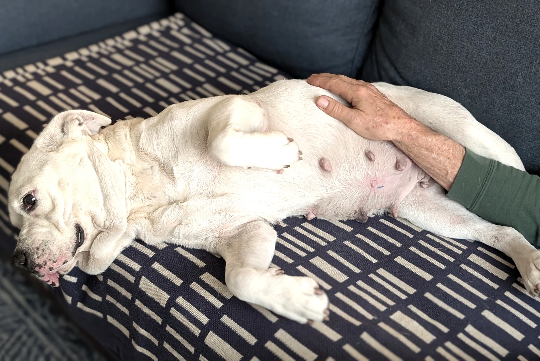 Elsa is a senior female bulldog mix that was taken by humane enforcement after negligent care. She received injection treatments for her heartworms and had a benign mass removed from her stomach. She's put on a little weight slowly but has a bright spirit. She is excited about car rides and is really quiet on them (so far). She is tolerant of other dogs and likes to play with toys. She would really love a family to take her for short walks and enjoy some couch hippo time.