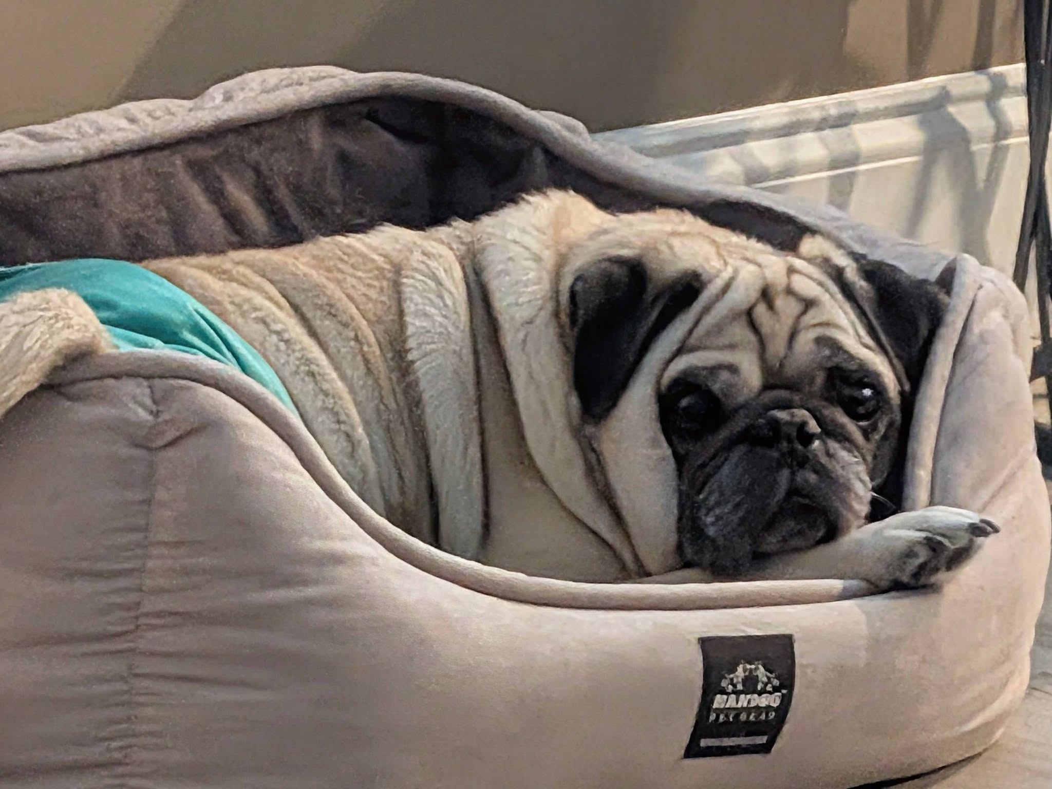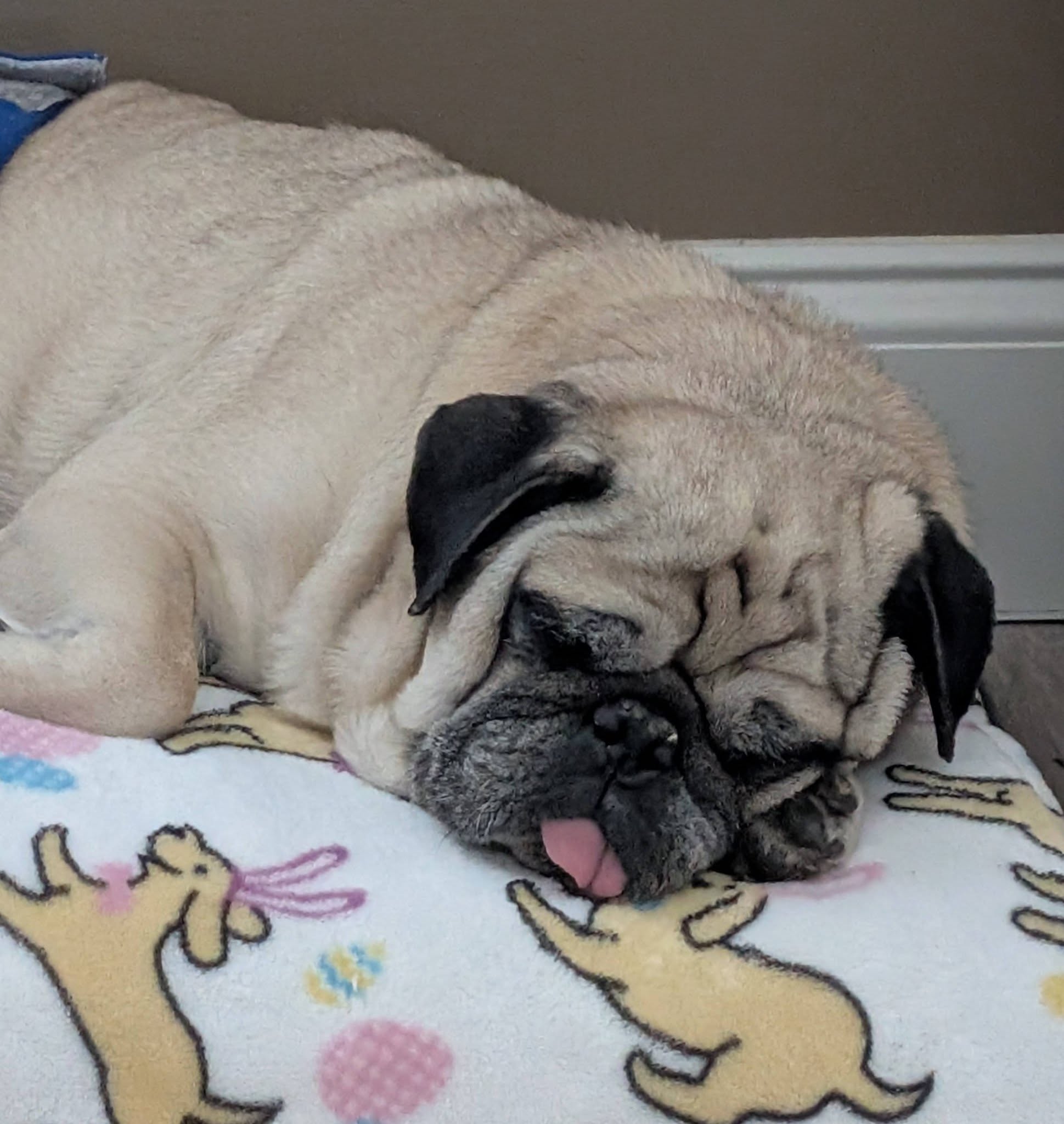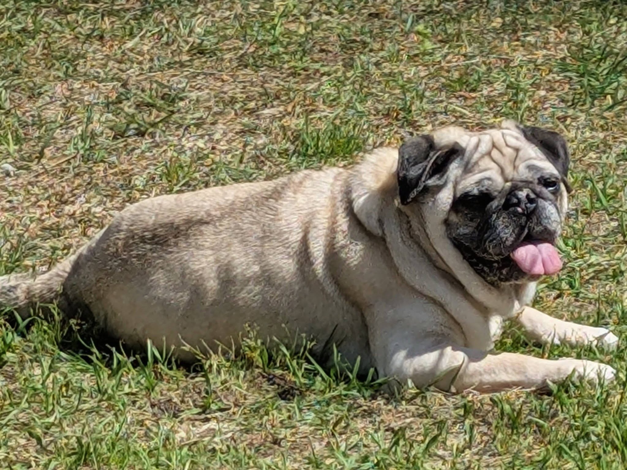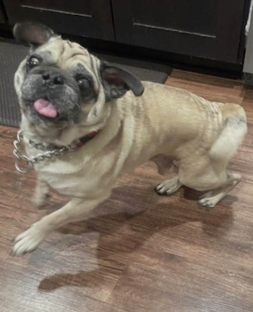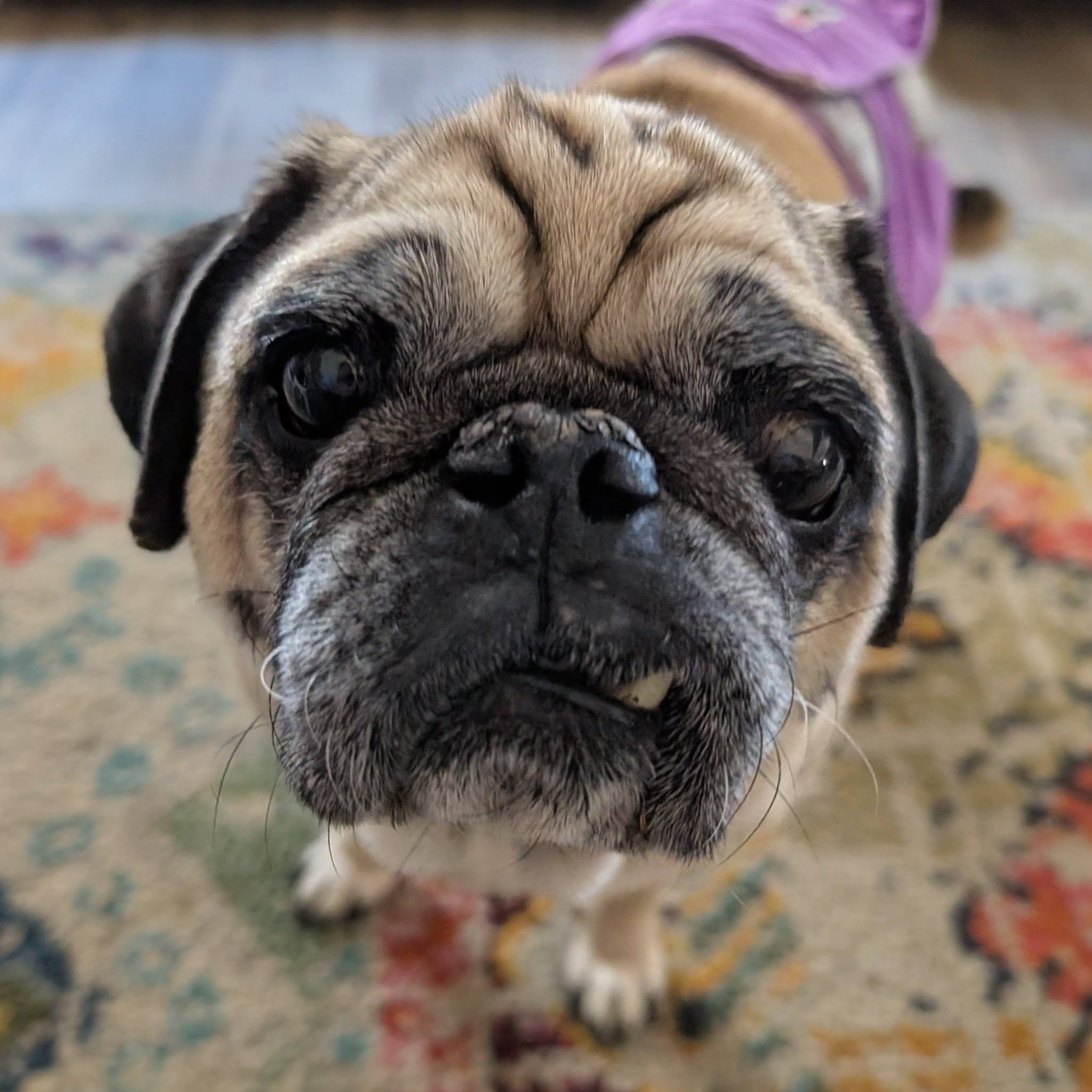 Cori is a 14 yr old pug with a lot of life left in him (hopefully) . His hobbies include eating, sleeping and following his person around the house ....everywhere. Cori also loves staring blankly at you while you talk to him although he probably can't hear a word you're saying - he's very hard of hearing. Cori feels anything worth doing must be done while his tongue hangs out of his mouth. Cori doesn't care about other dogs or cats....he pays them zero attention.