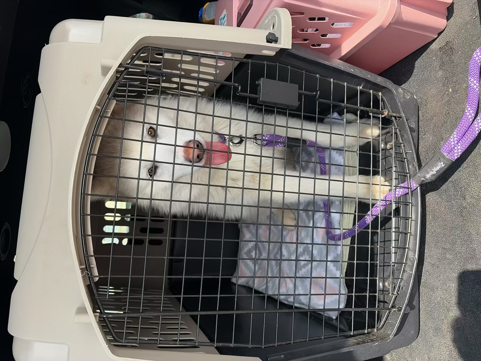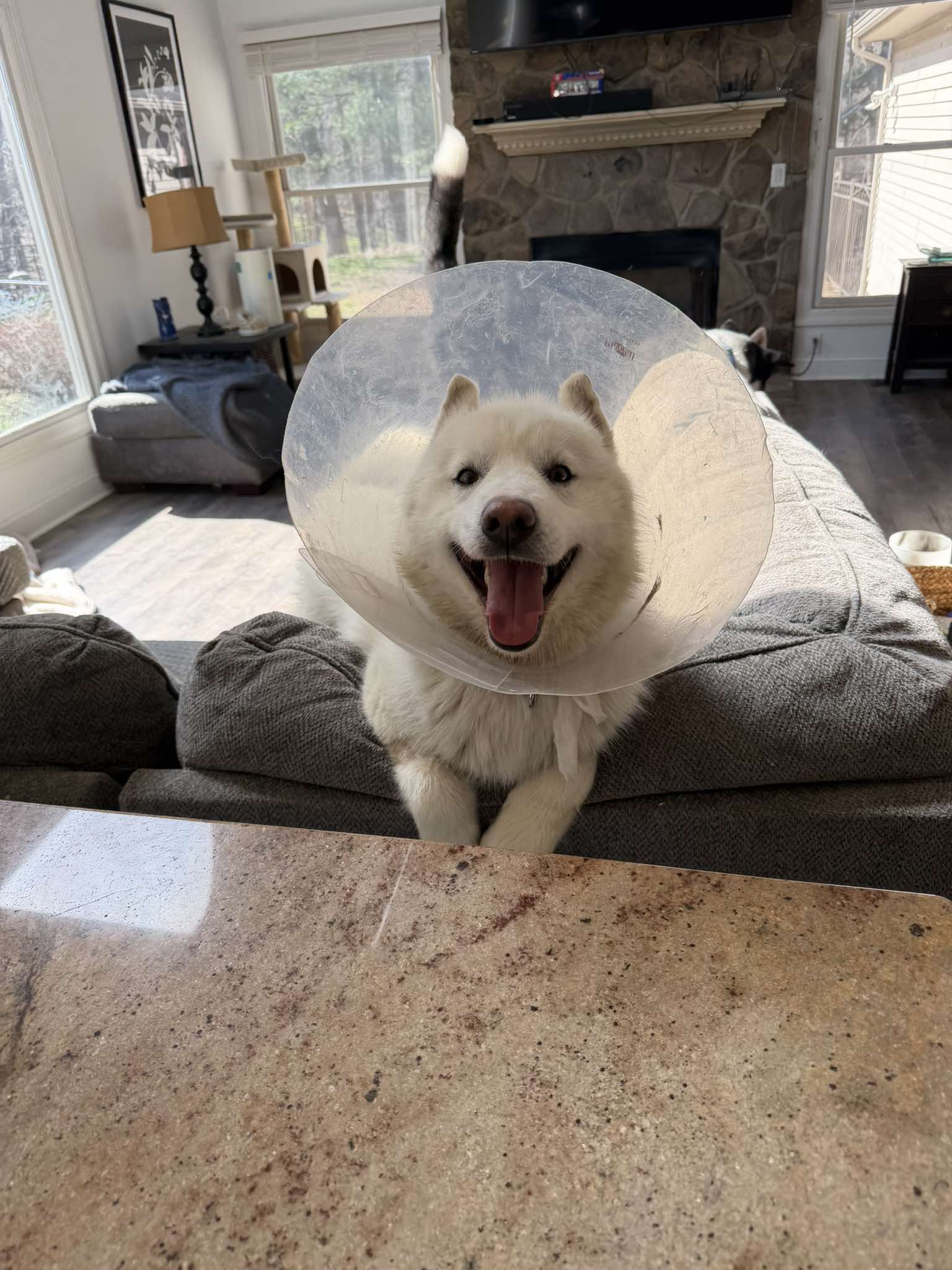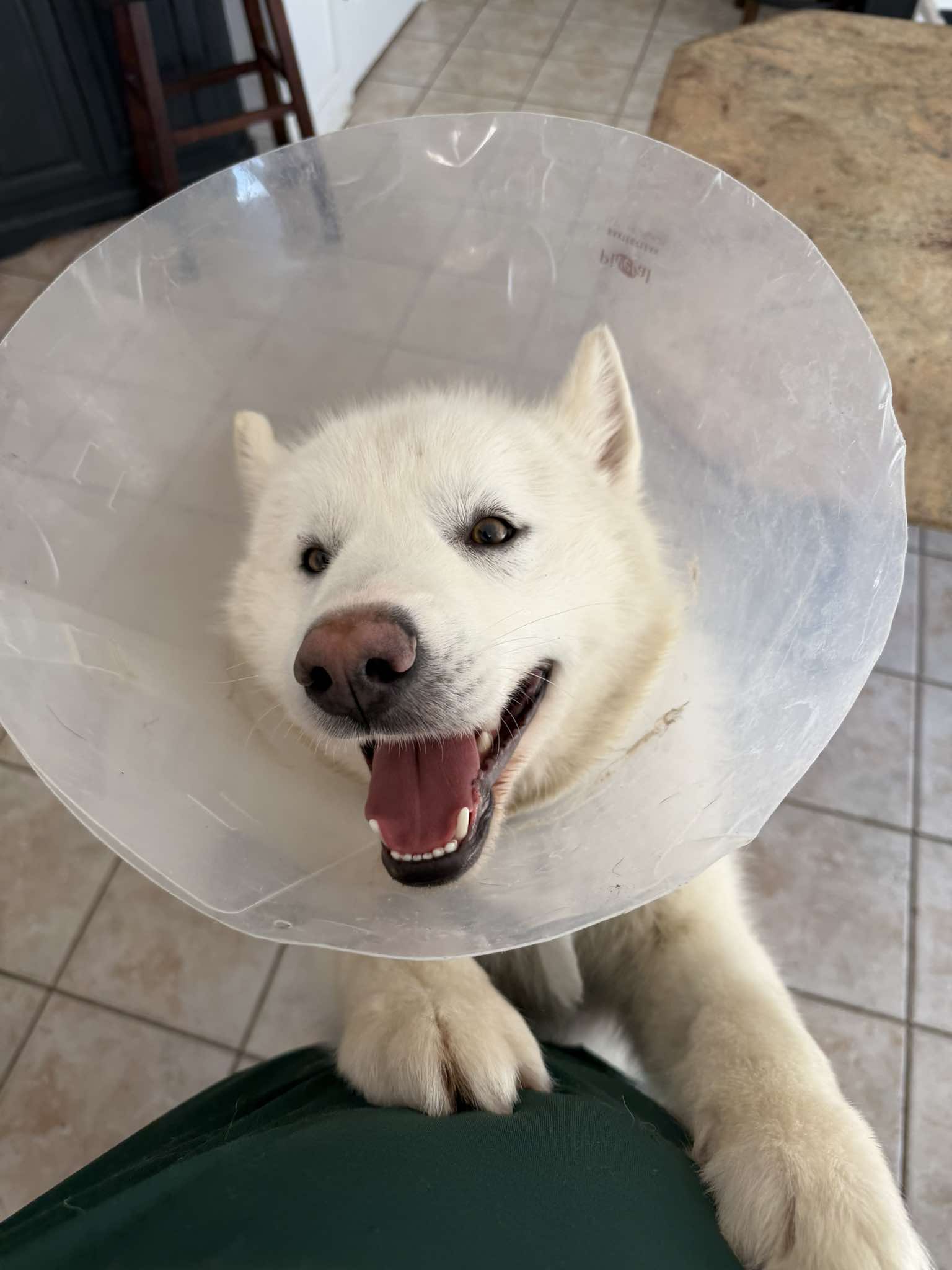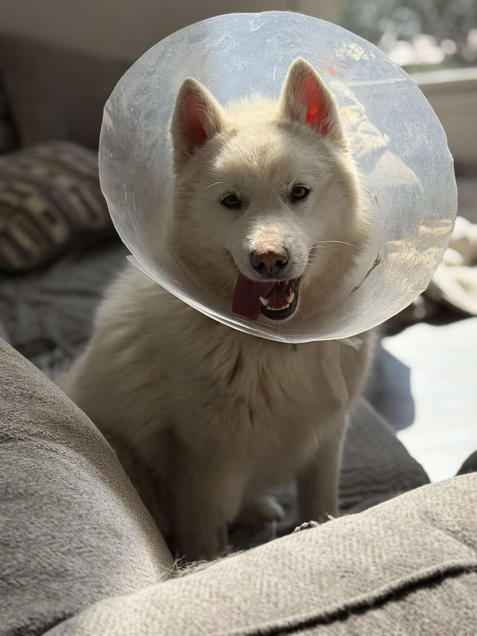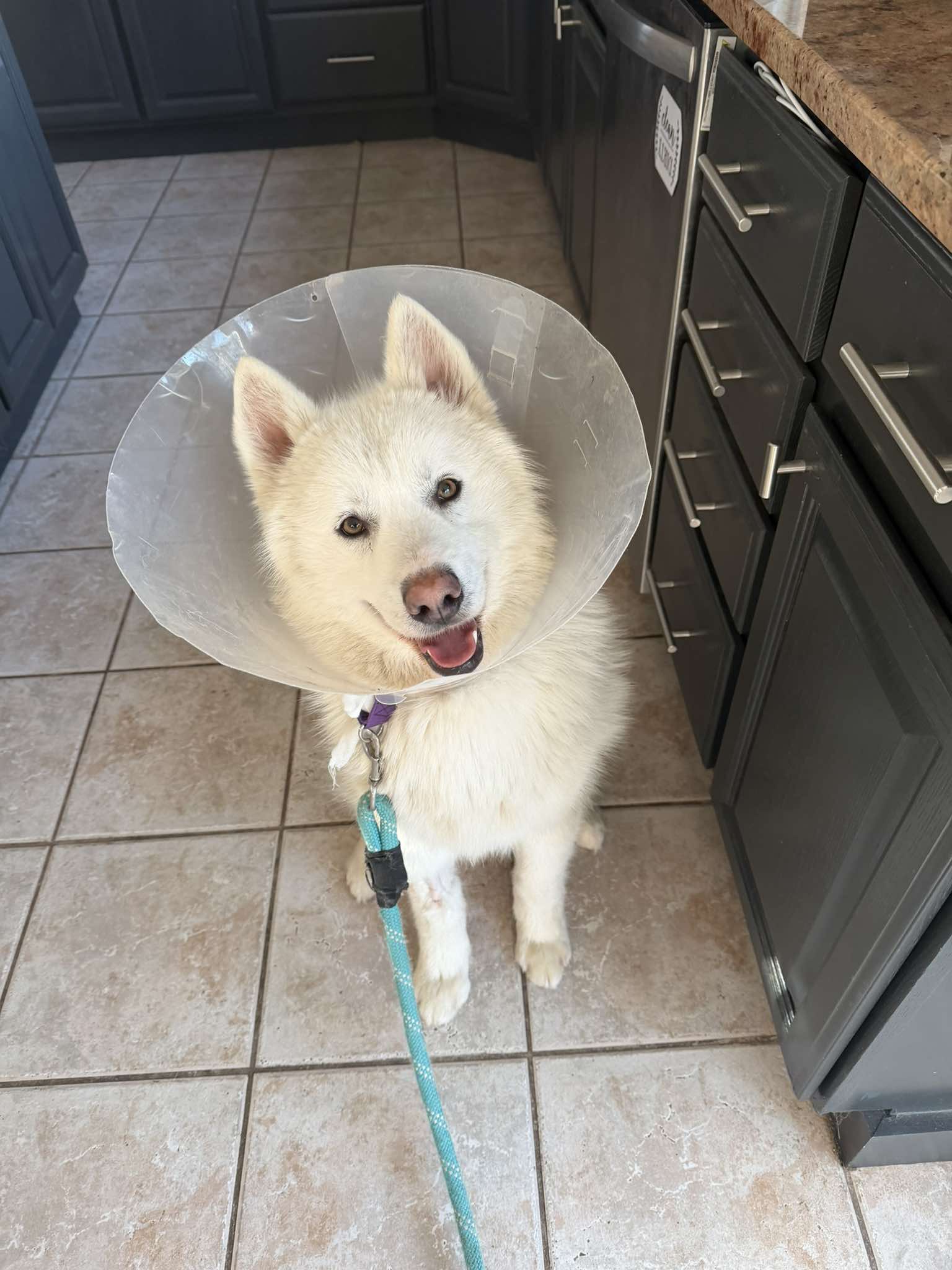 This handsome young pup was found as a stray, but you’d never guess it from his sweet and playful personality! Luria is a male white husky who loves to have fun and gets along great with other dogs.