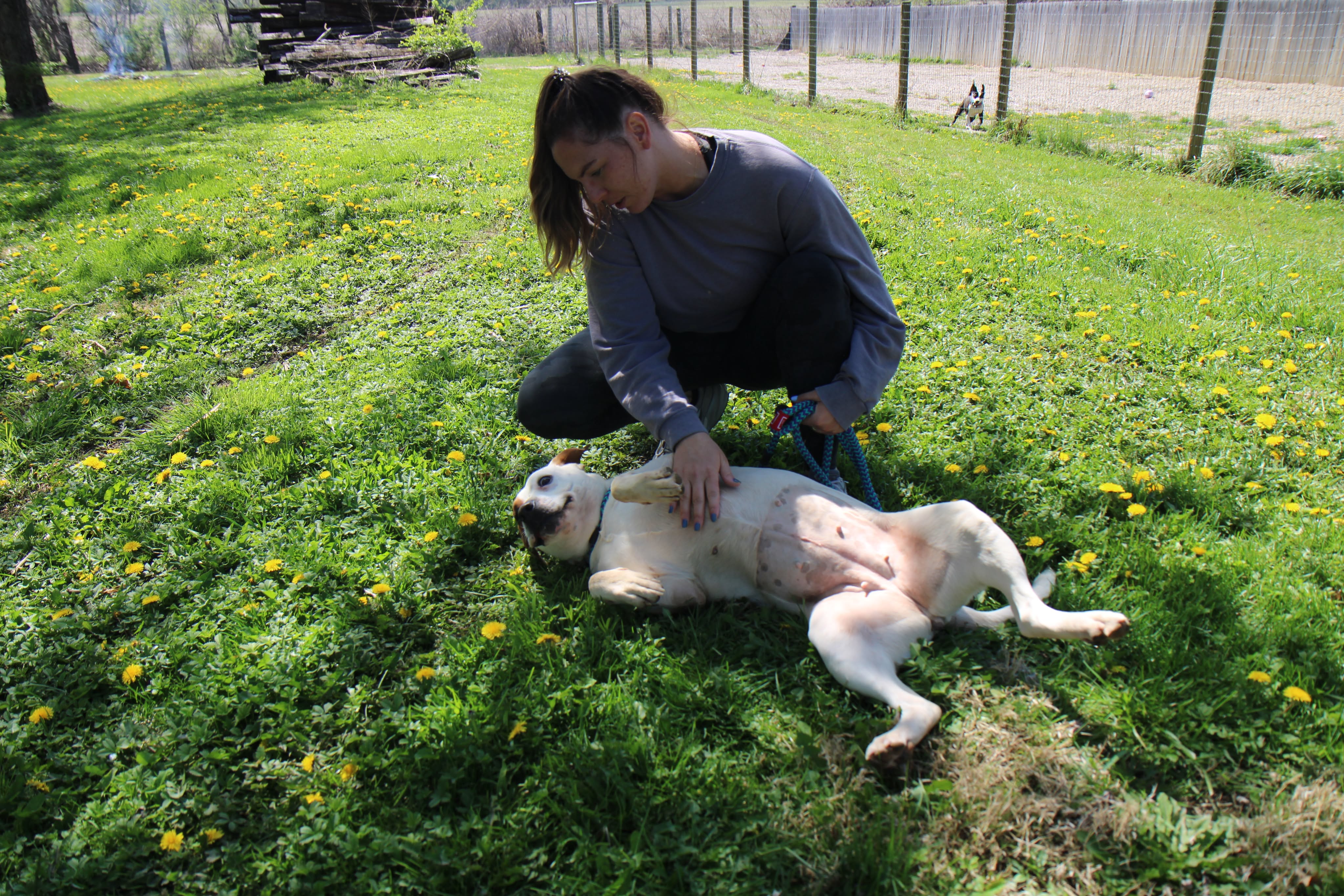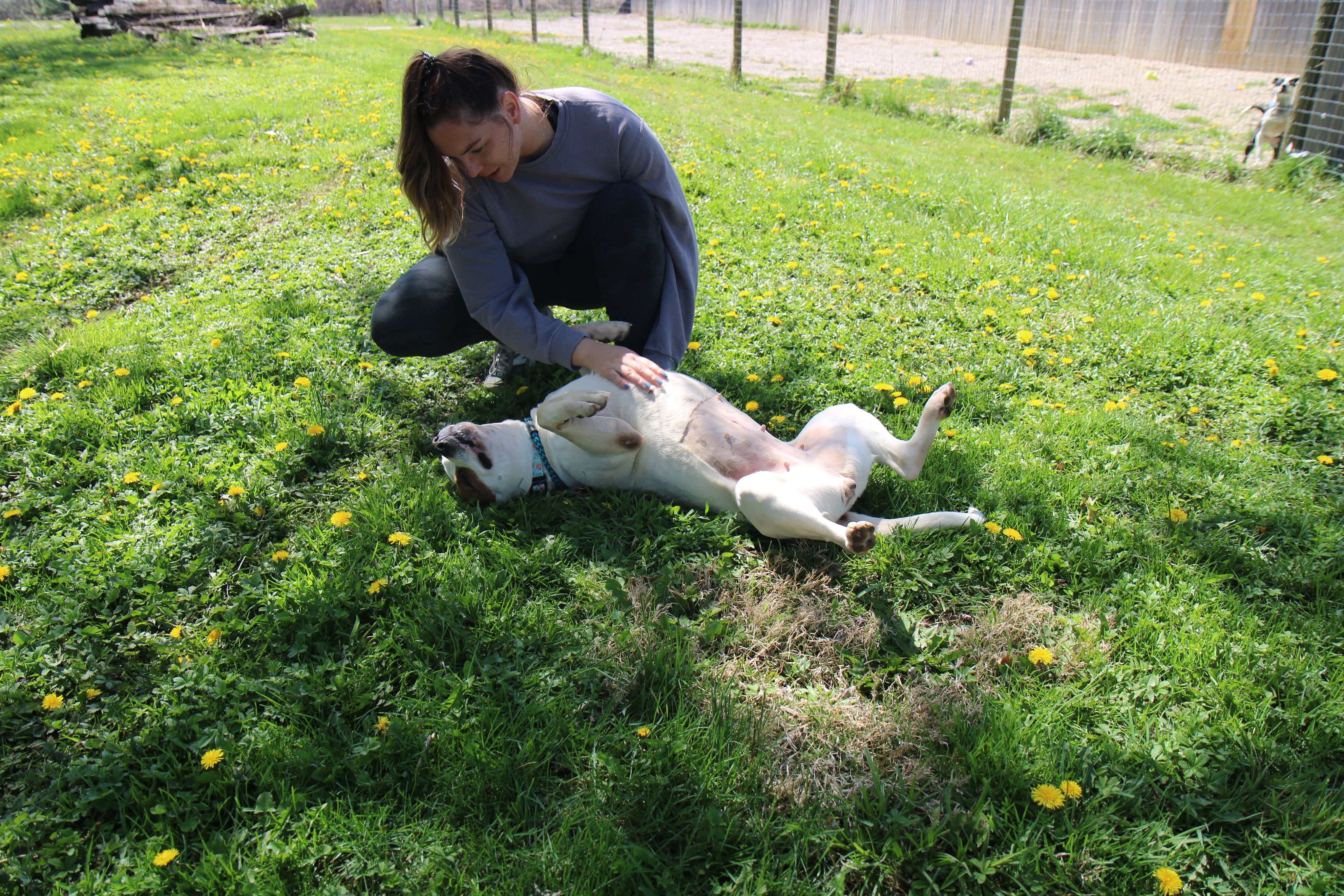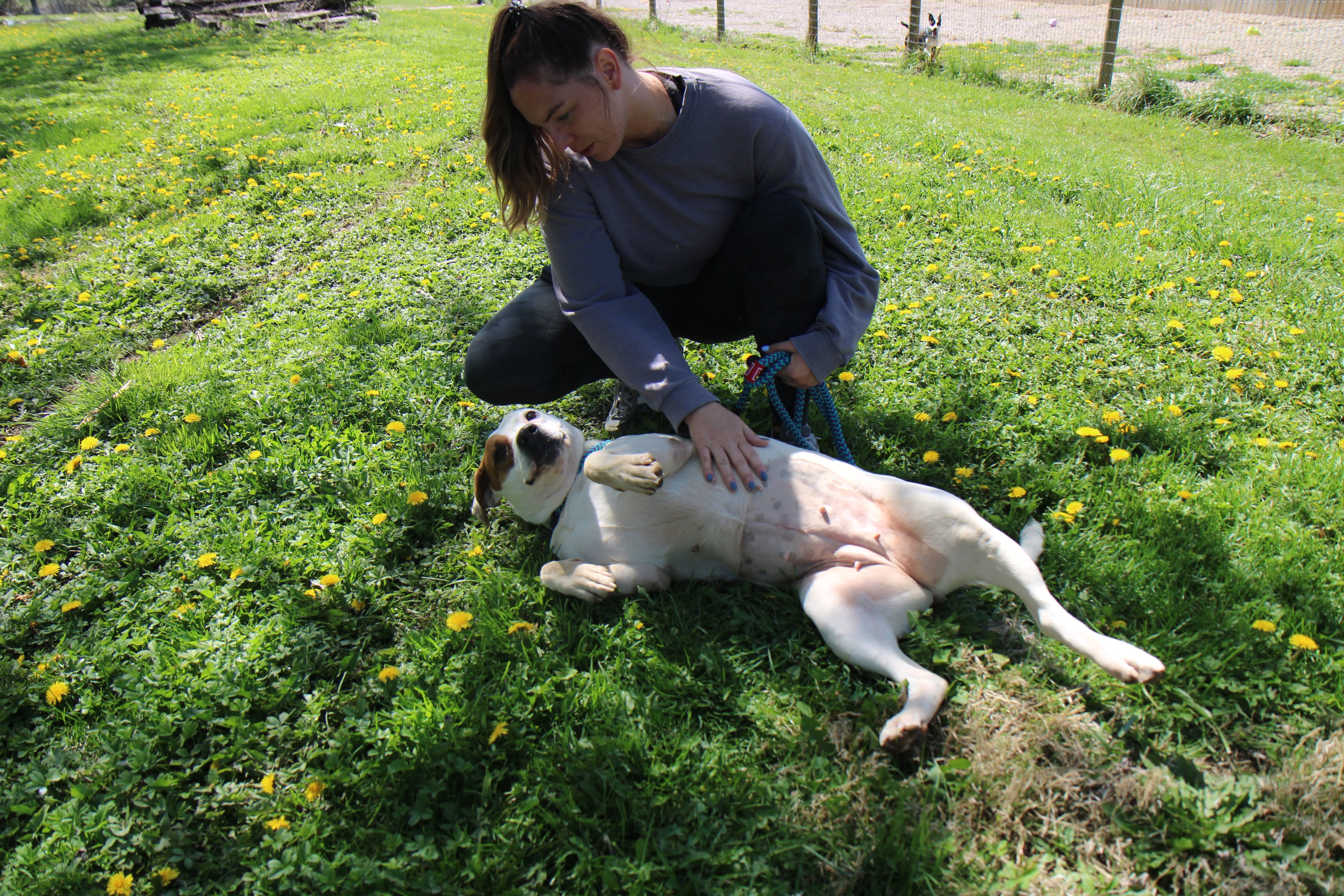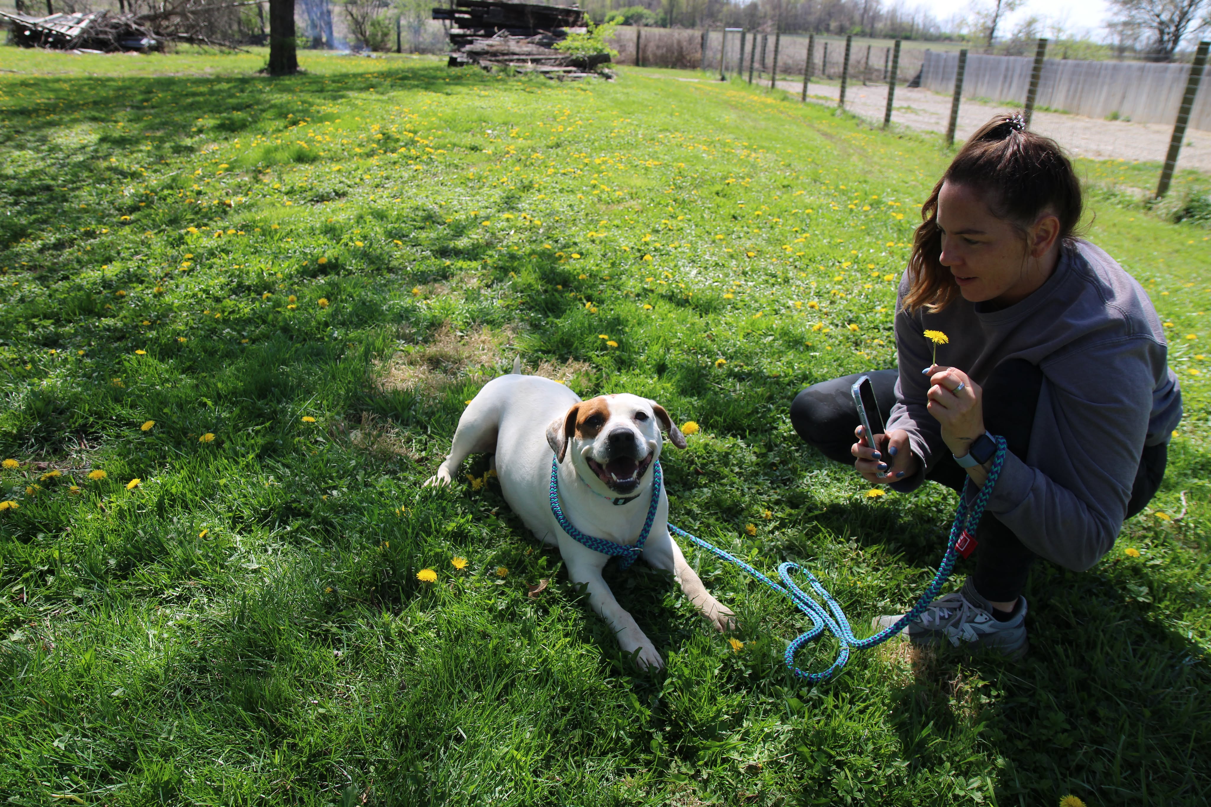 She has a nice balance of playful and calm. She’ll happily roll around in the grass, then settle in for pets and quality time with her people. She’s the kind of companion who fits easily into your day — whether that’s a walk, some outdoor time, or just relaxing together.