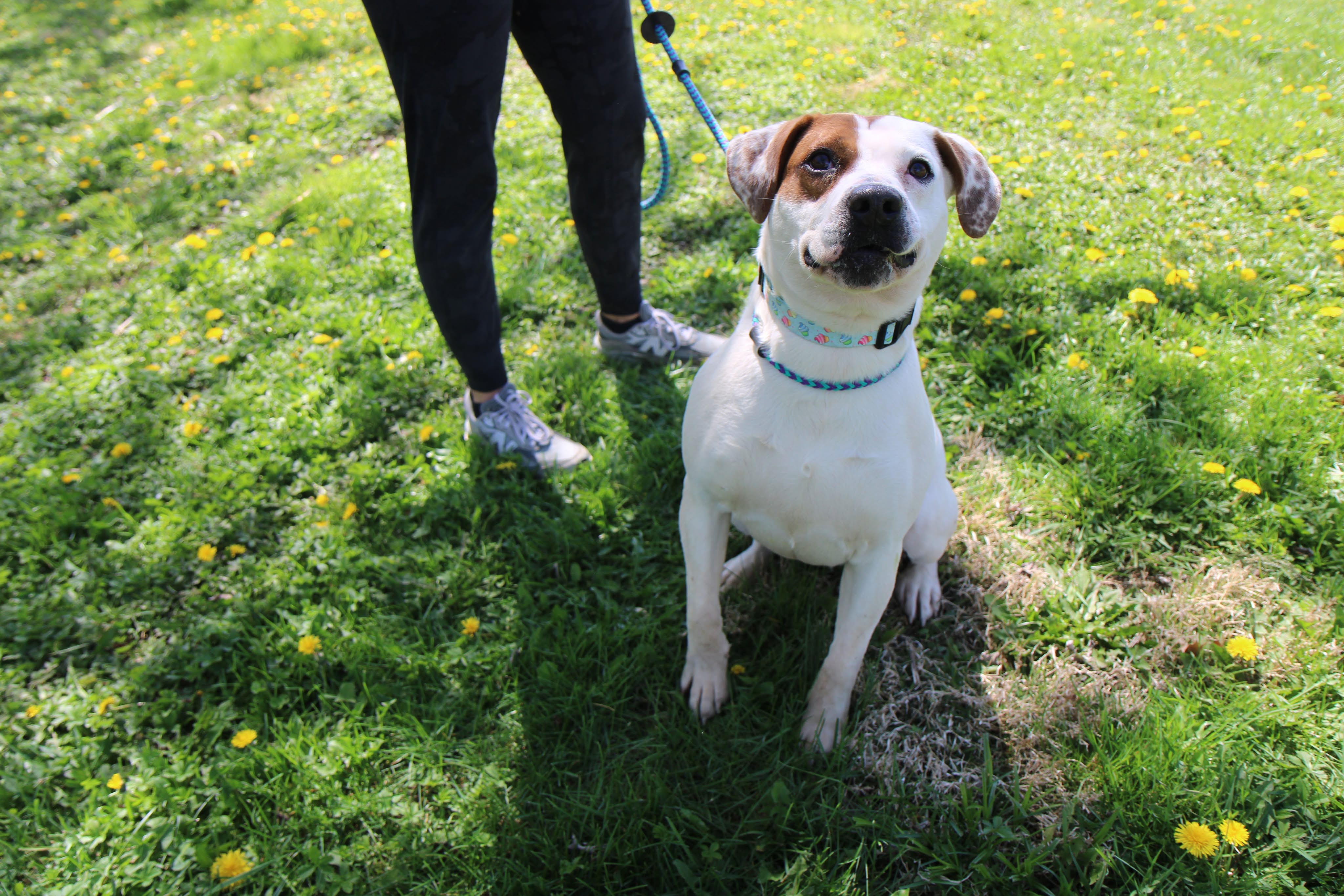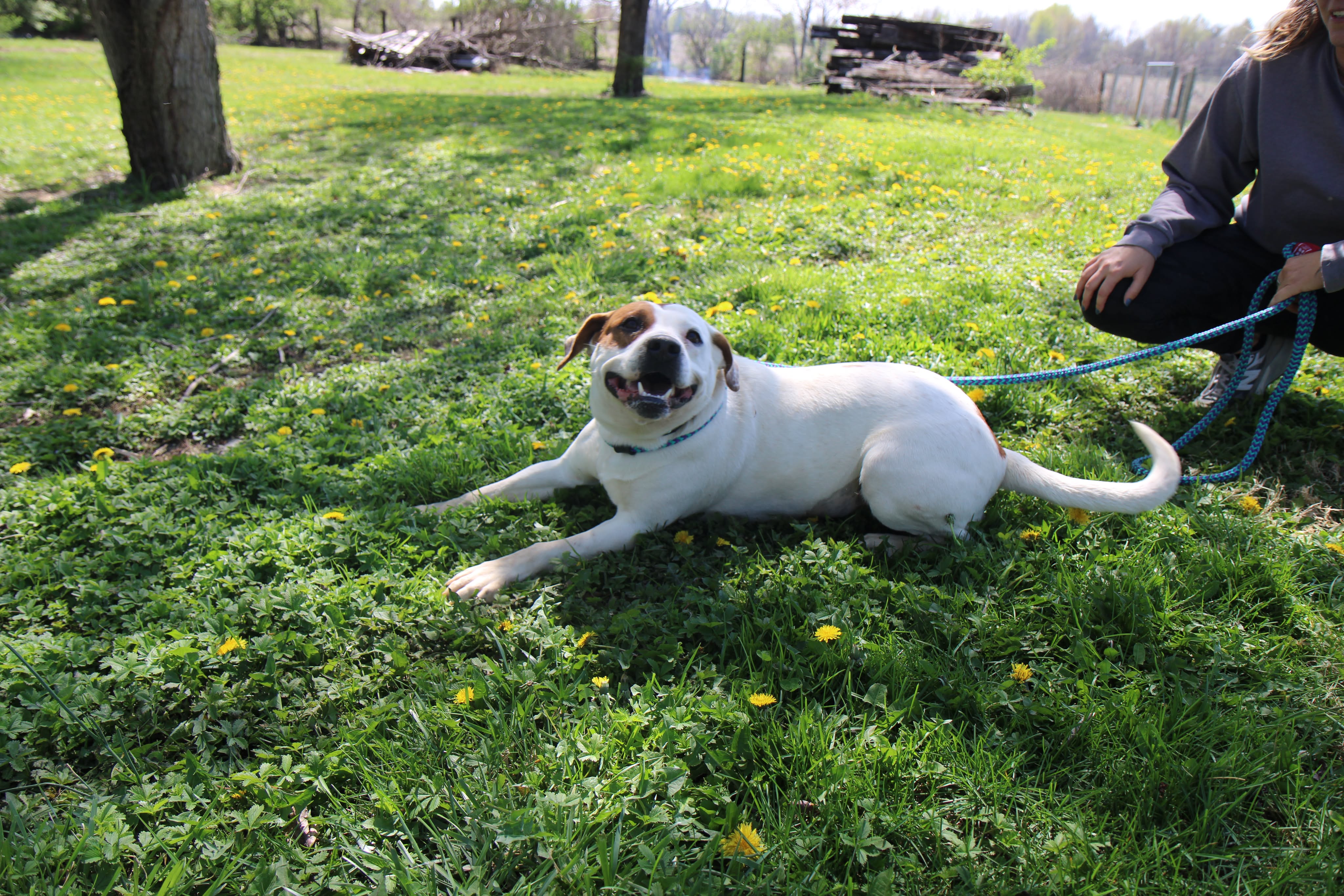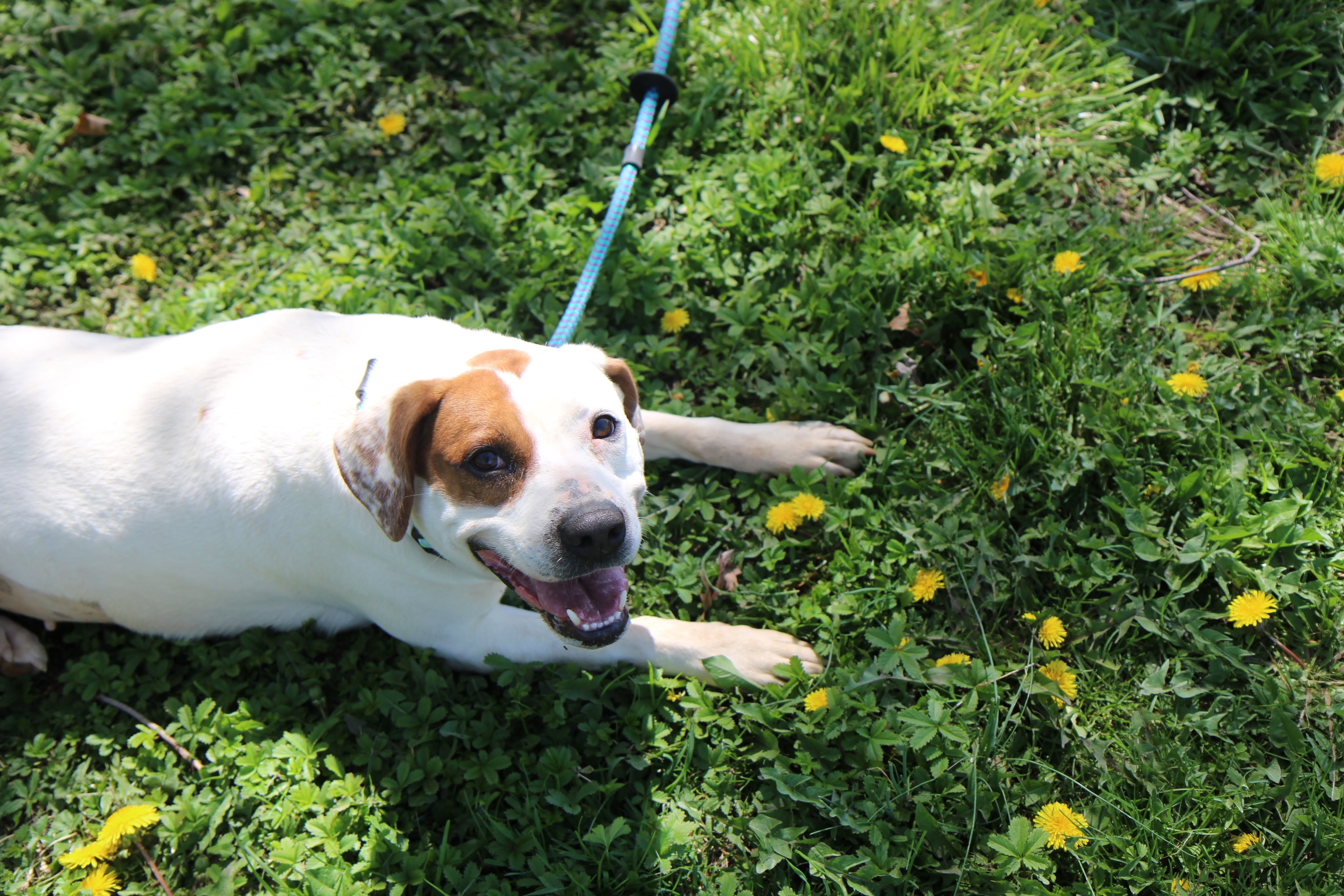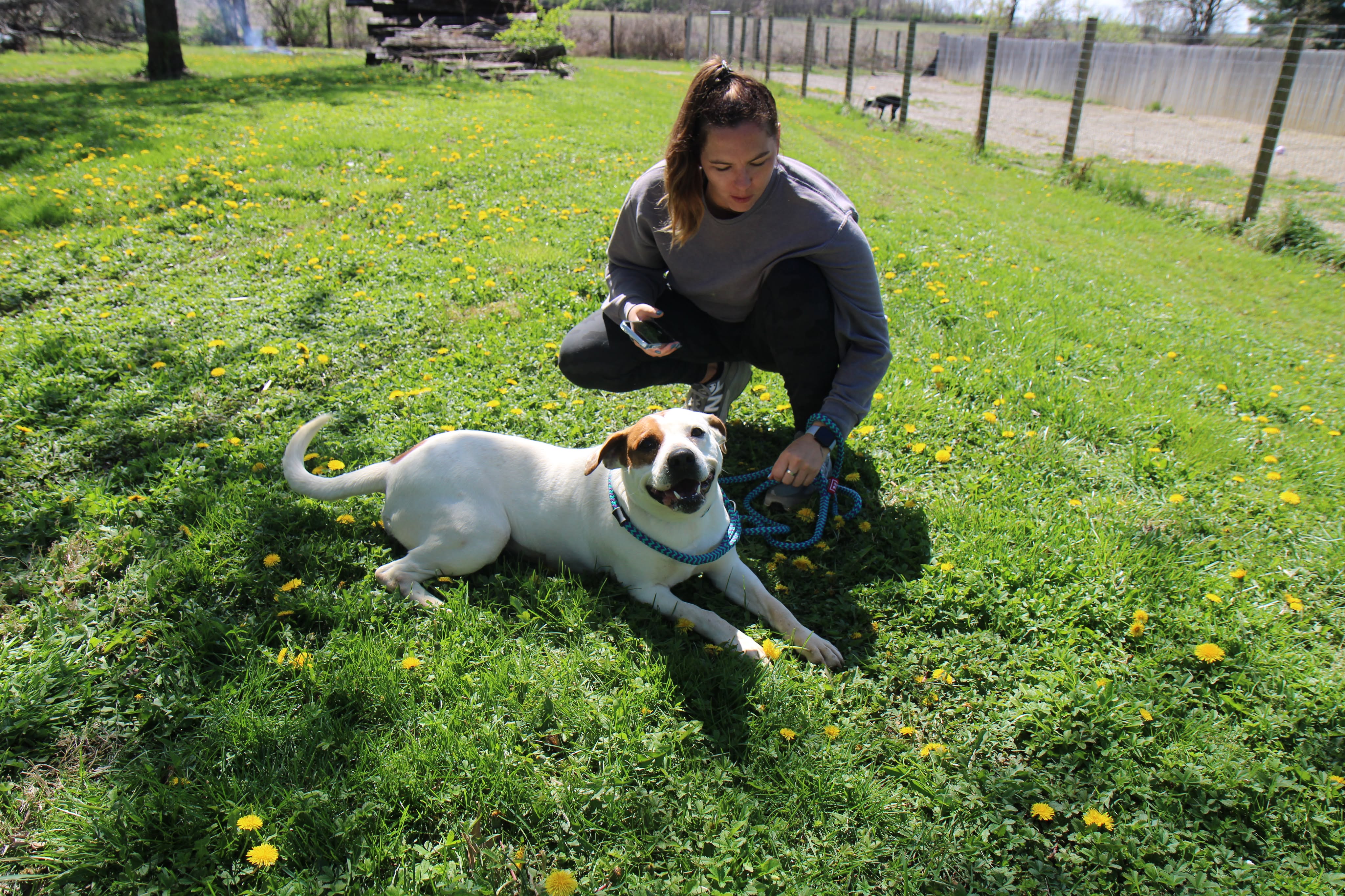 She has a nice balance of playful and calm. She’ll happily roll around in the grass, then settle in for pets and quality time with her people. She’s the kind of companion who fits easily into your day — whether that’s a walk, some outdoor time, or just relaxing together.