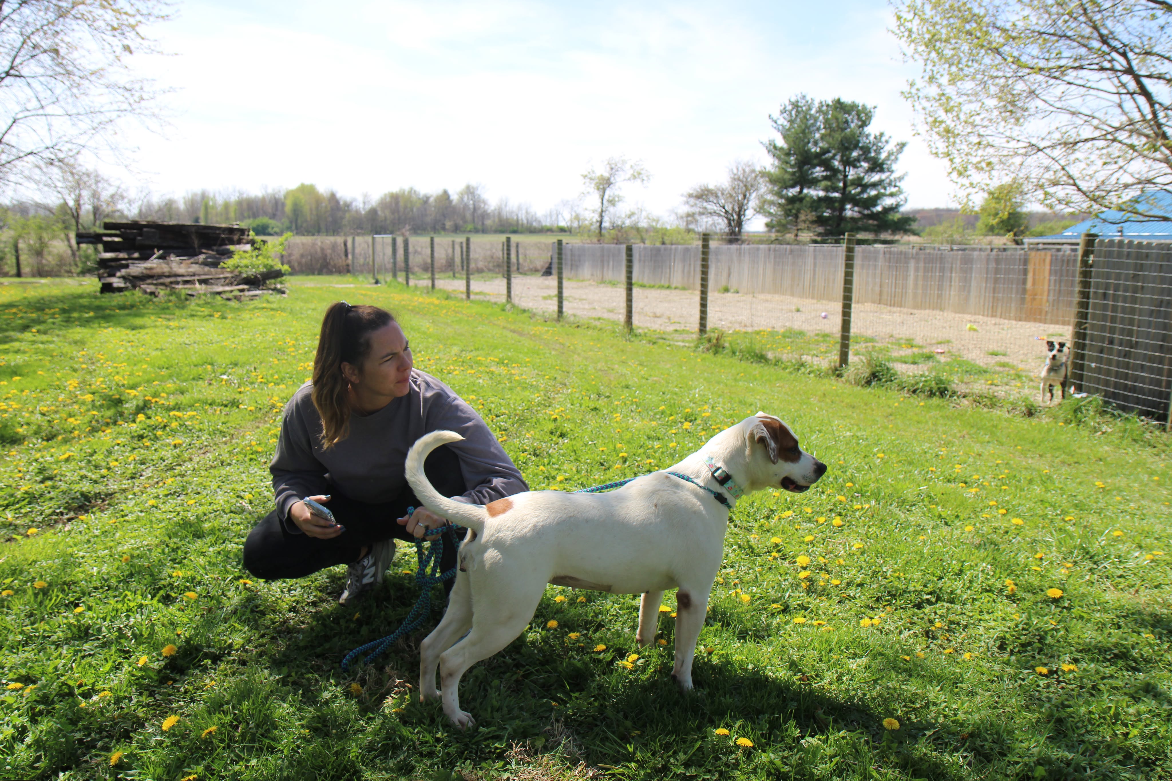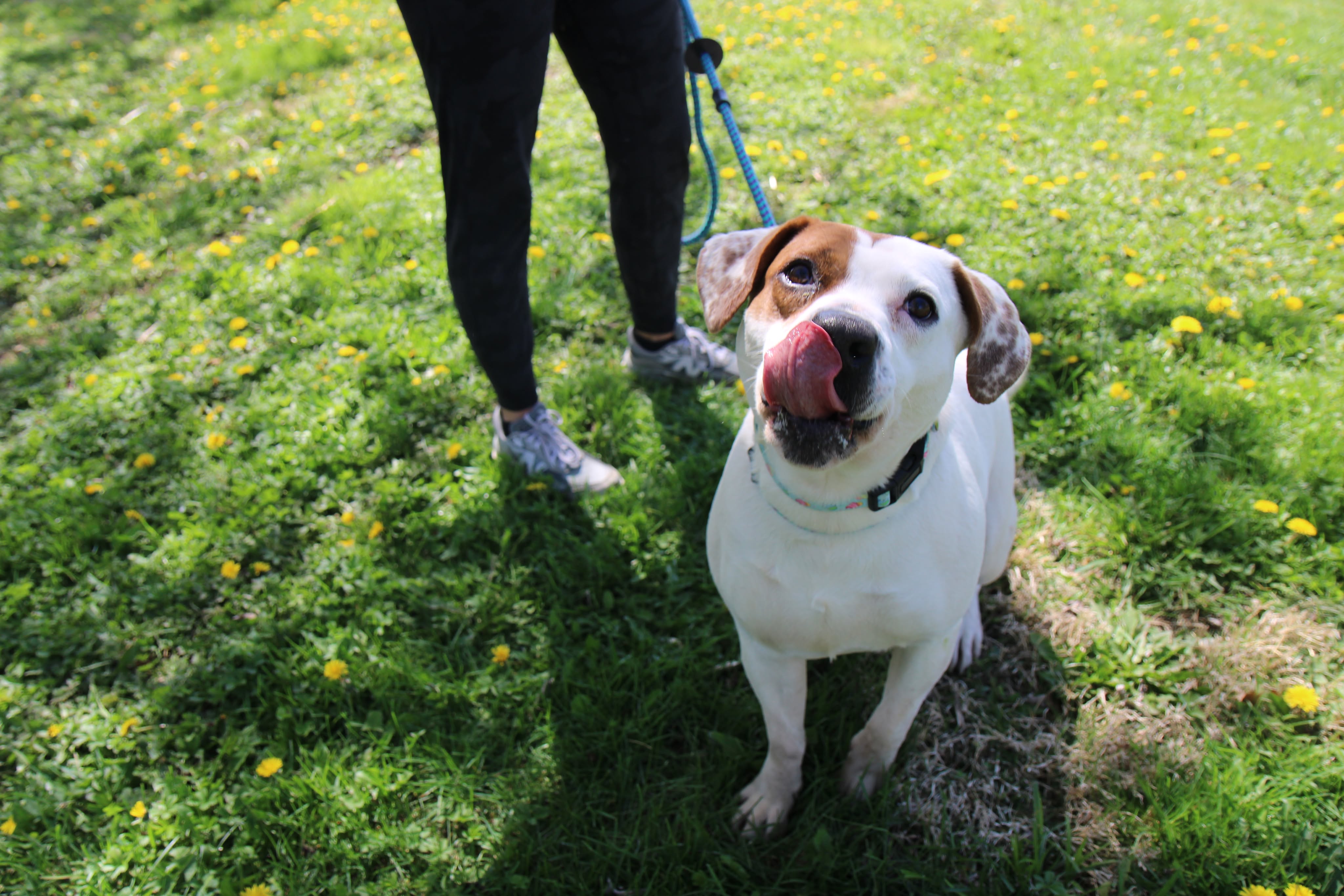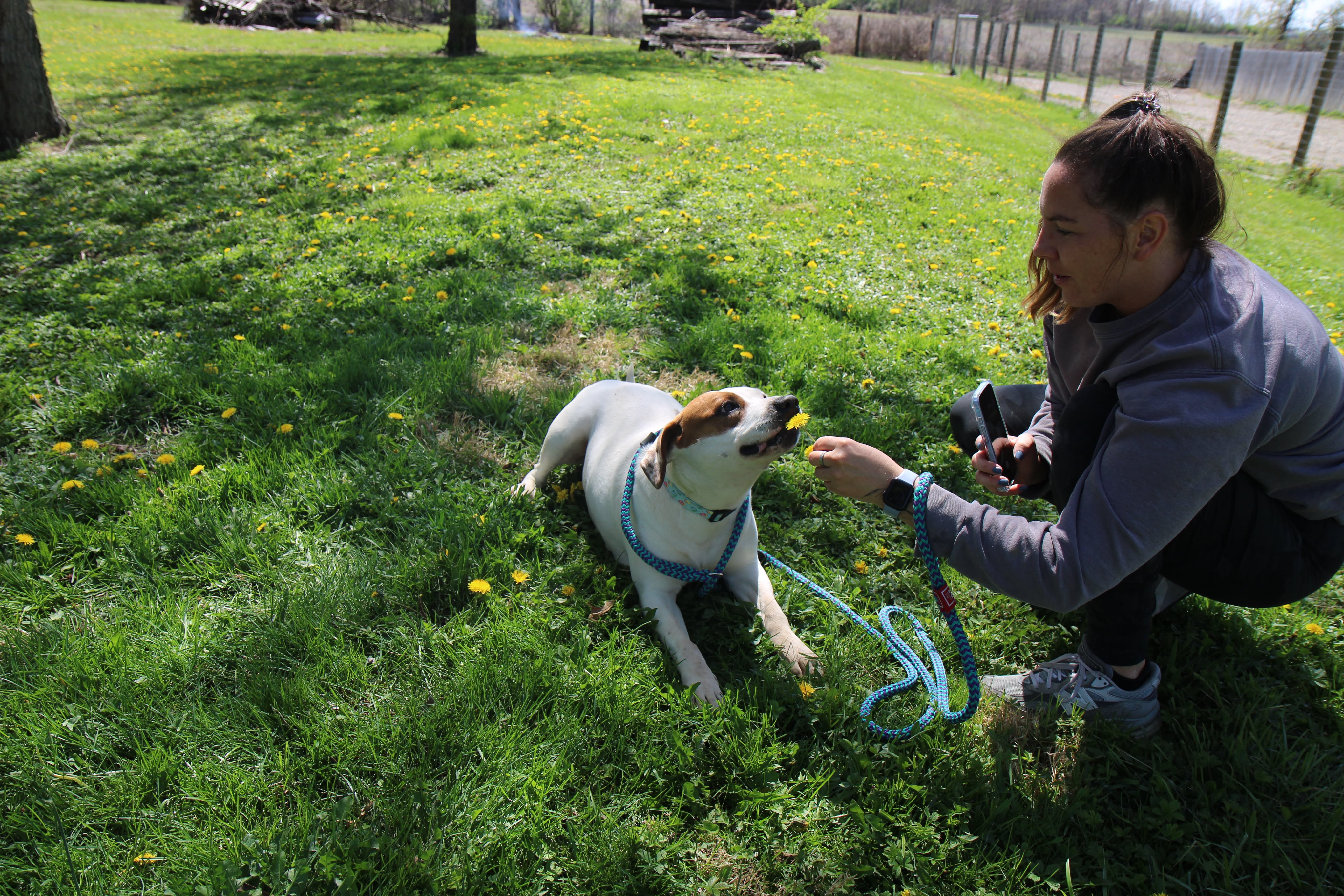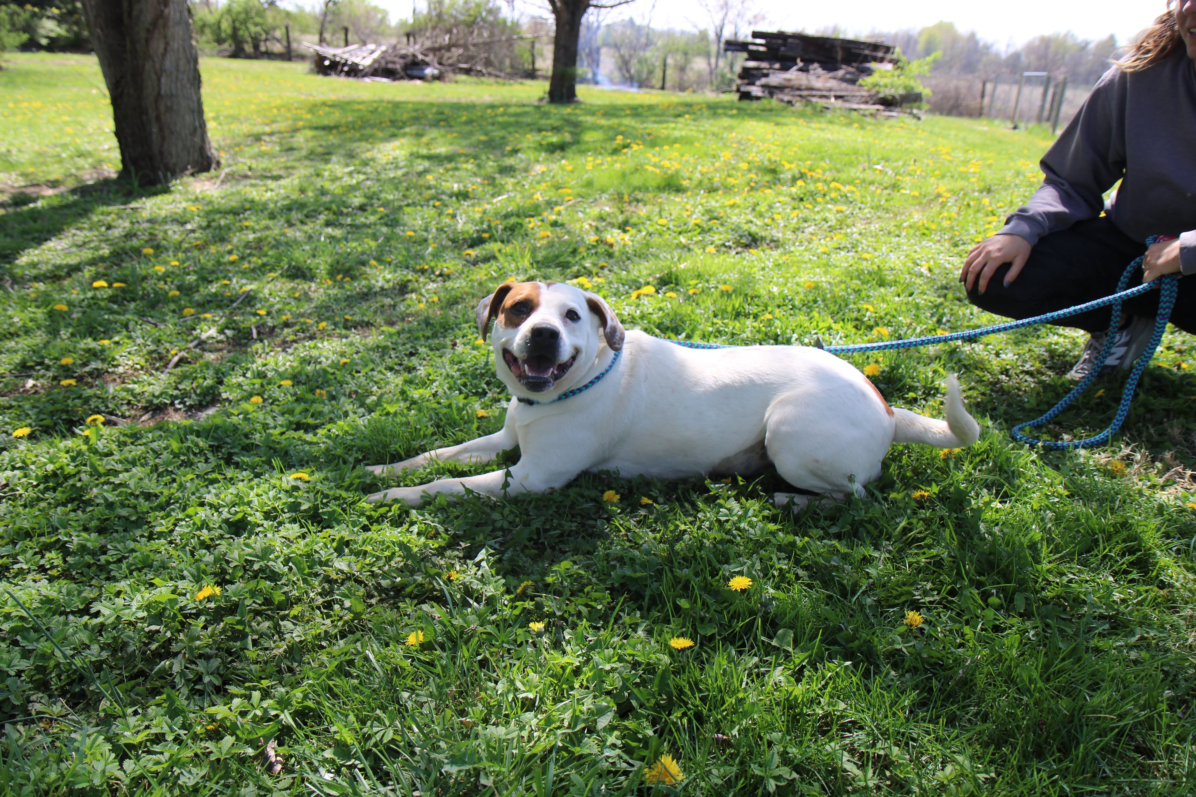 She has a nice balance of playful and calm. She’ll happily roll around in the grass, then settle in for pets and quality time with her people. She’s the kind of companion who fits easily into your day — whether that’s a walk, some outdoor time, or just relaxing together.