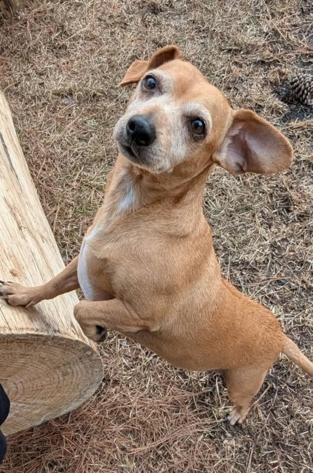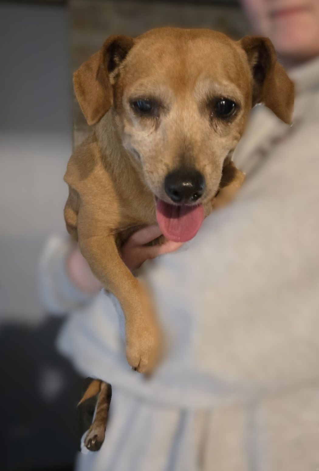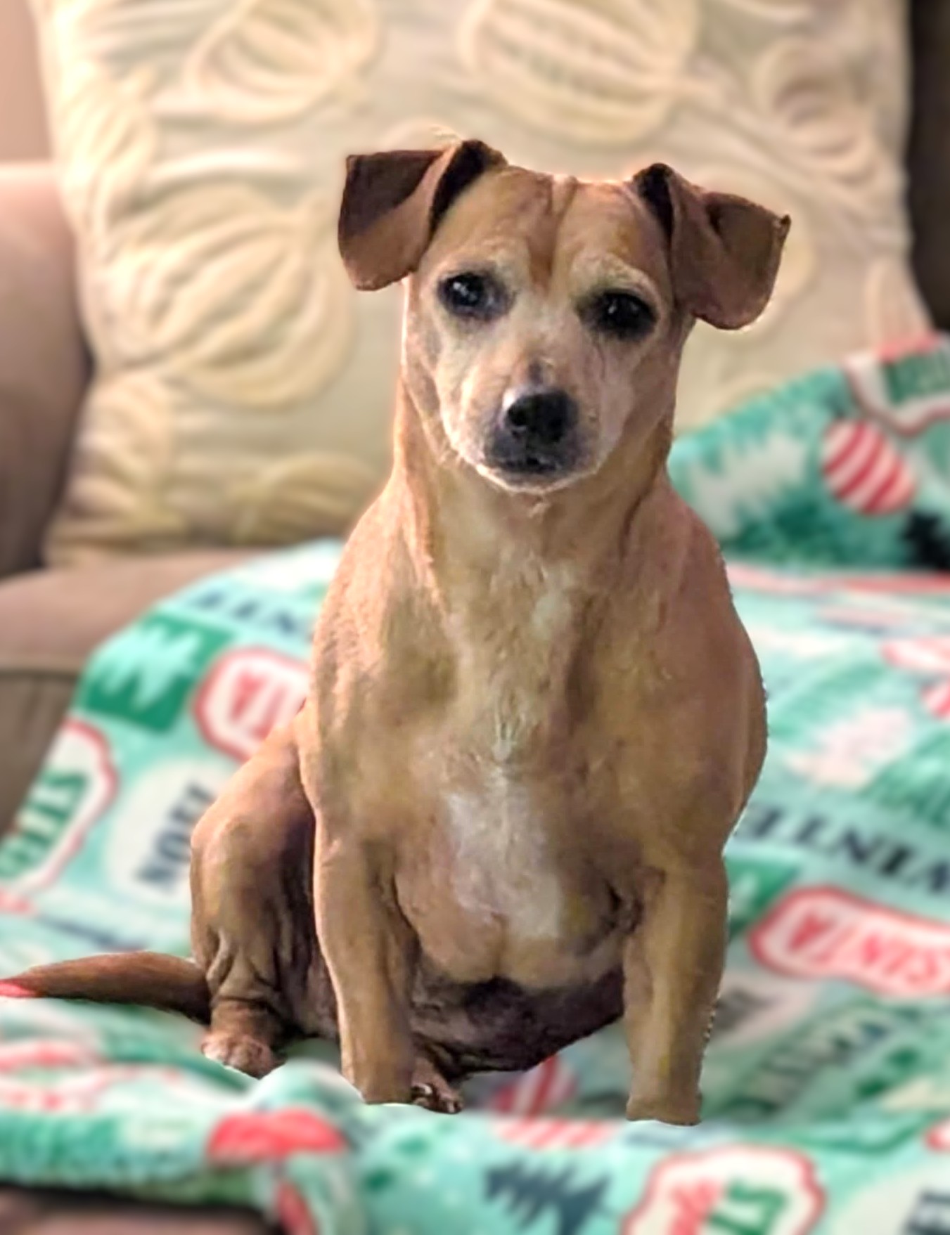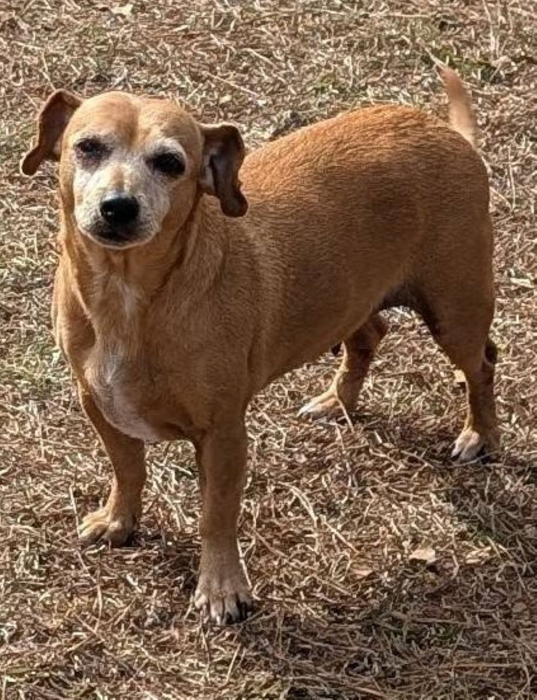 Trixie is a shy, sweet mature doxie mix who came to rescue with her three housemates after losing their home and owner to a house fire. One thing that's apparent about all of these girlies is that they have been generously overfed! Trixie is now in foster and on a weight reduction diet to hopefully improve her overall health and long-term lifestyle. We are still learning about Trixie as she settles in to her foster home and we'll update information as we get it.