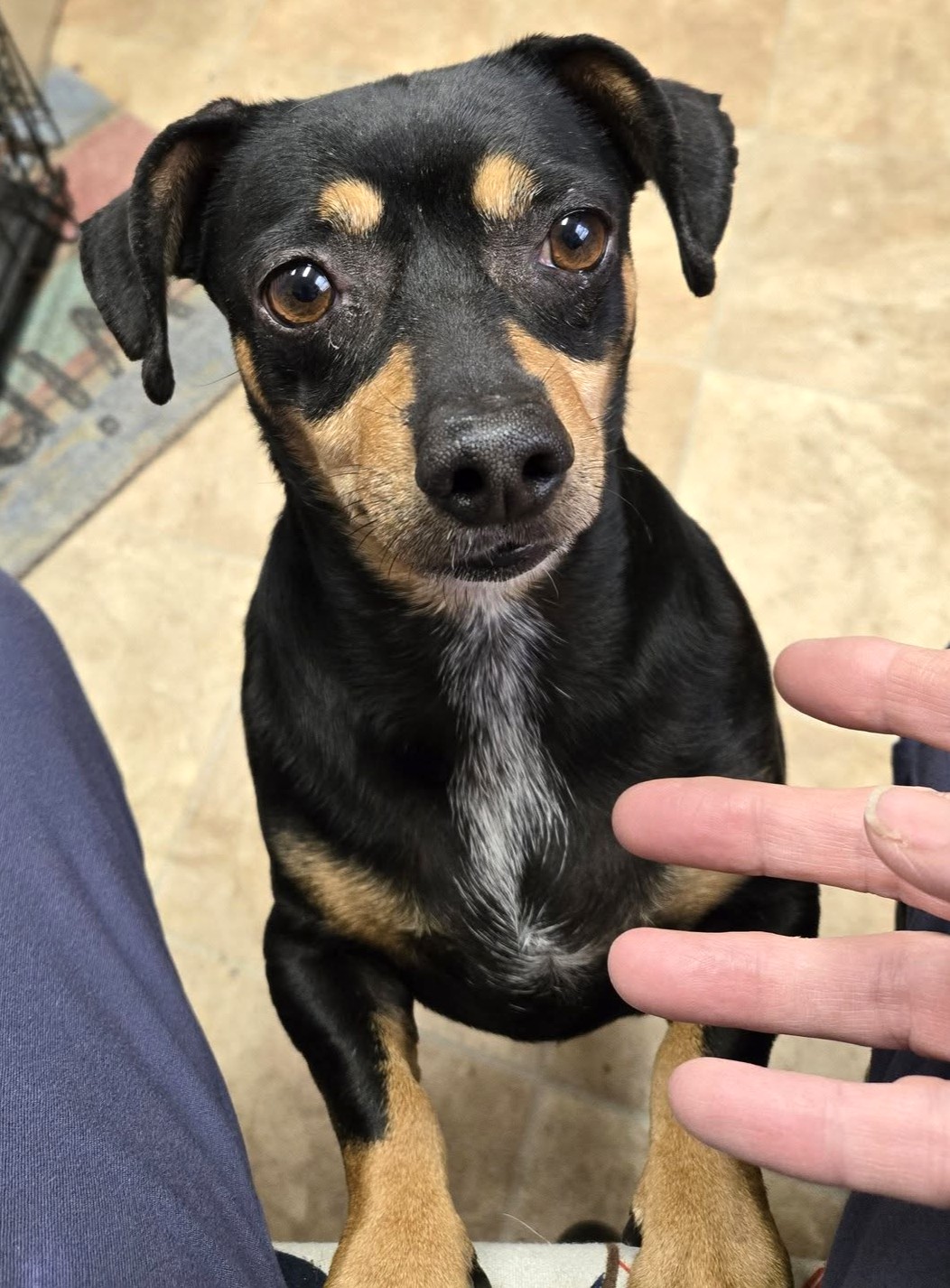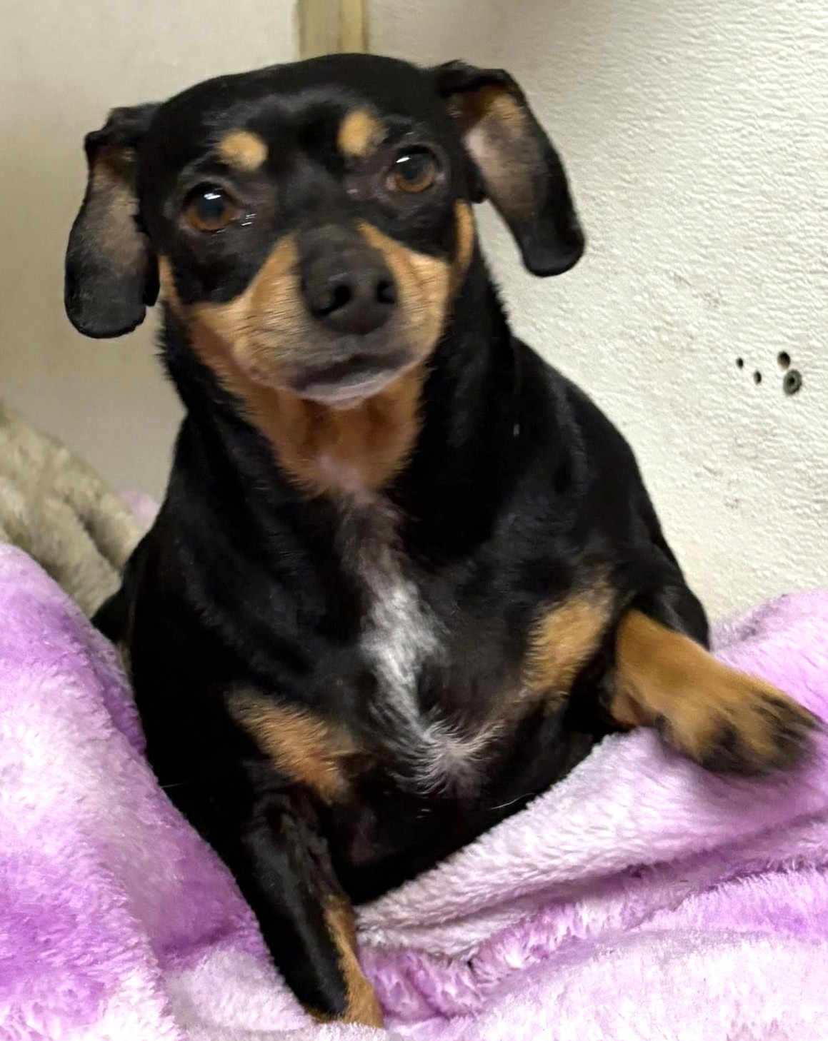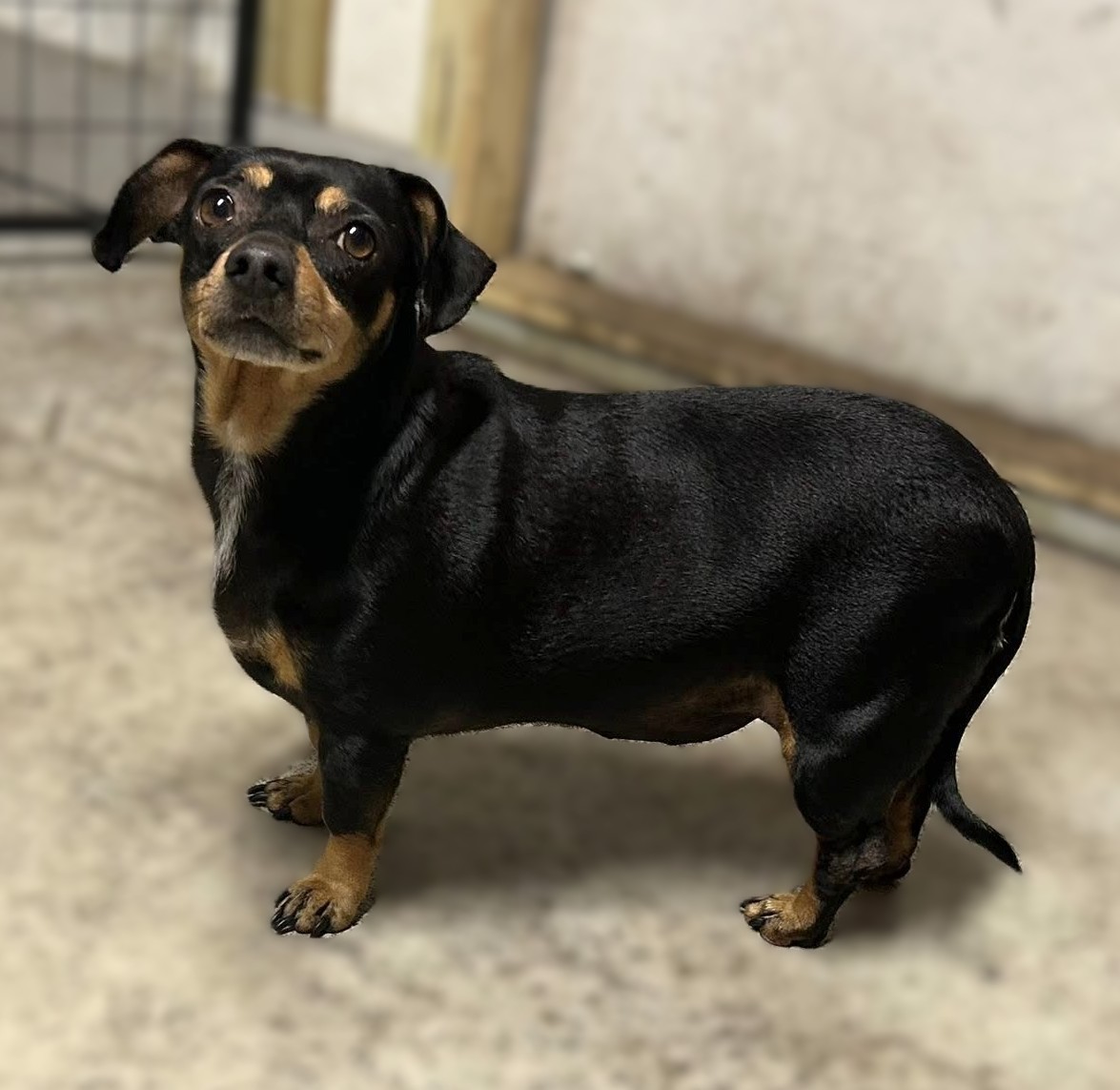 Lightning is a shy, sweet mature doxie mix who came to rescue with her three housemates after losing their home and owner to a house fire. One thing that's apparent about all of these girlies is that they have been generously overfed! Lightning is now on a weight reduction diet to hopefully improve her overall health and long-term lifestyle. We are still learning about Lightning as she settles in, and we'll update information as we get it.